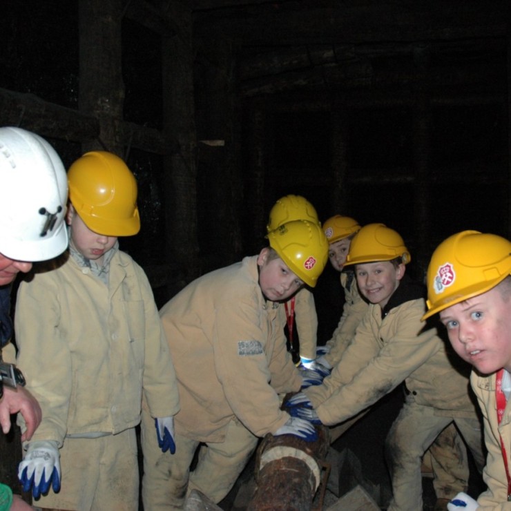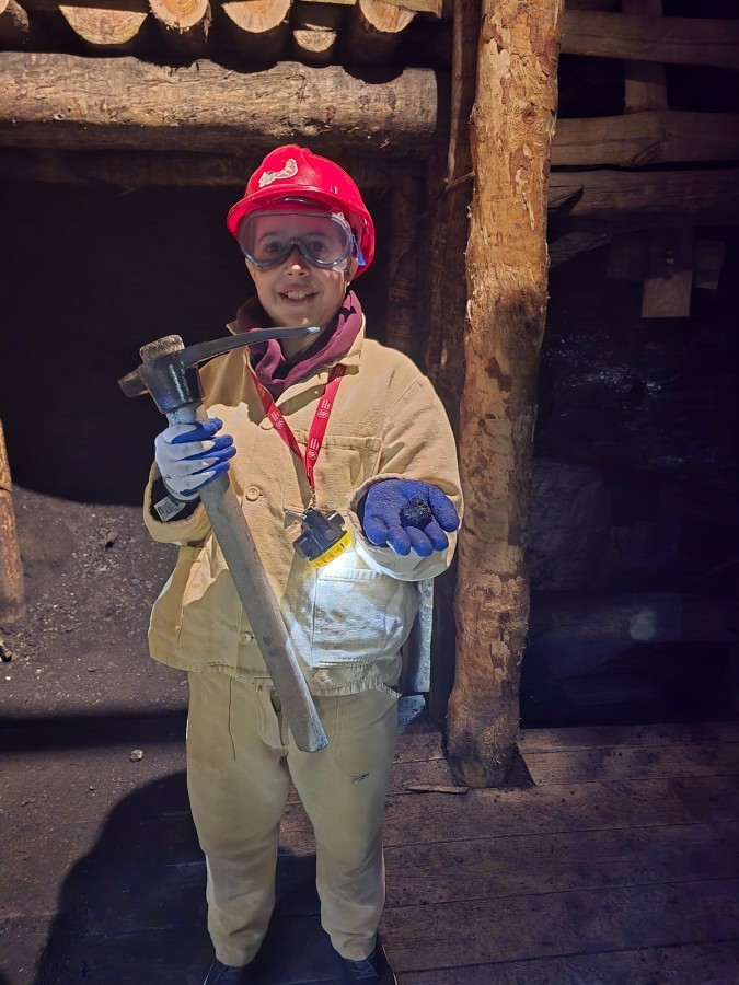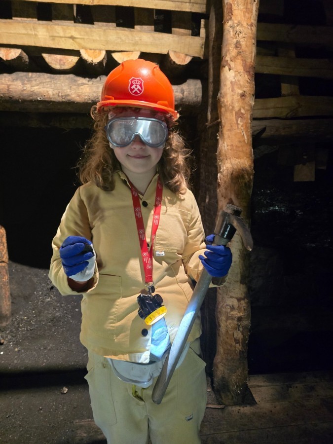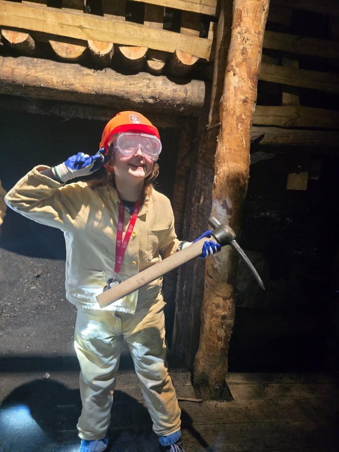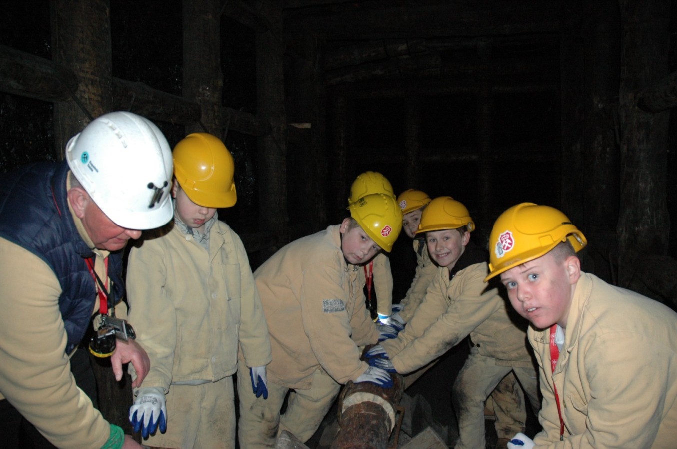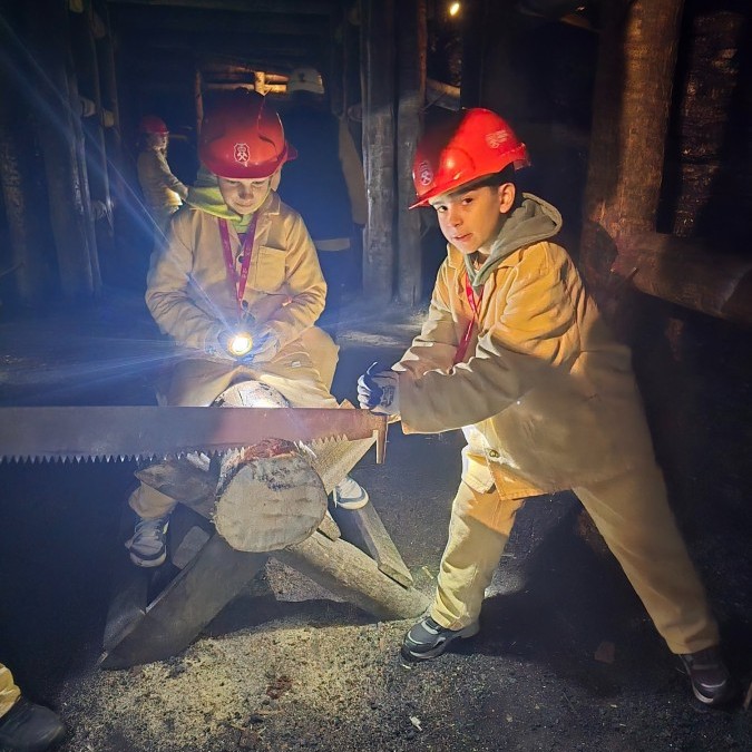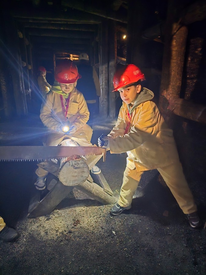 Ubrani w mundury i kaski czuliśmy się jak prawdziwi górnicy! Największą atrakcją było samodzielne kopanie węgla i praca kilofem 💪 Dodatkowo przecięliśmy kłodę piłą, uczyliśmy się udzielać pierwszej pomocy, a chodzenie górniczymi korytarzami było trochę straszne – podobno od dawna mieszka tam duch Skarbnika 👻