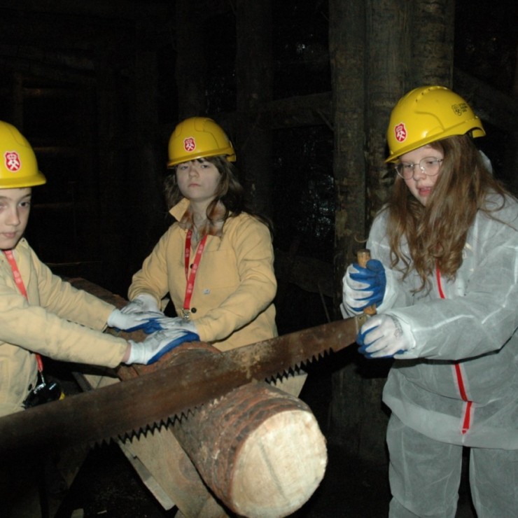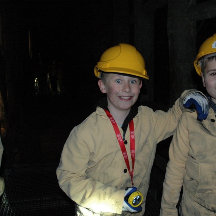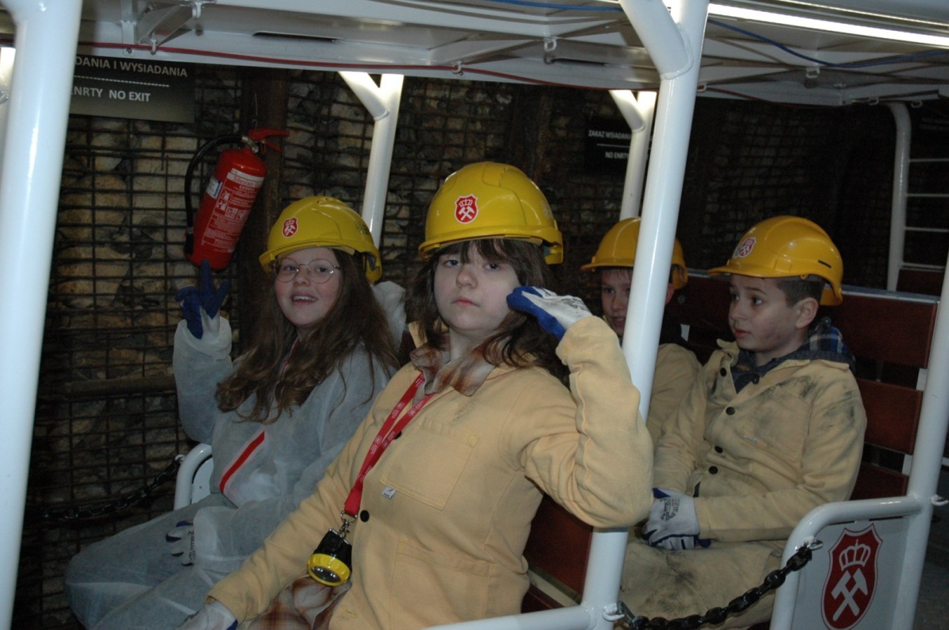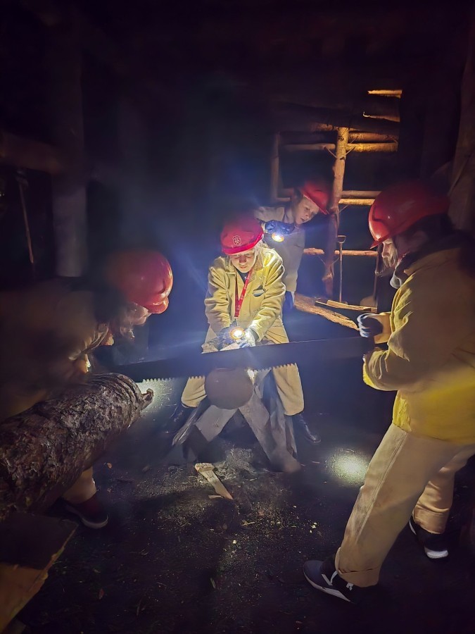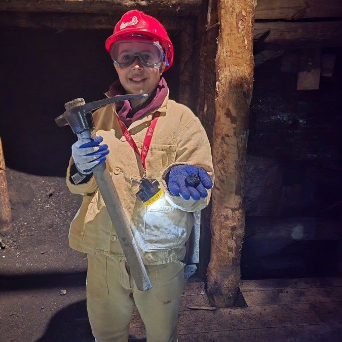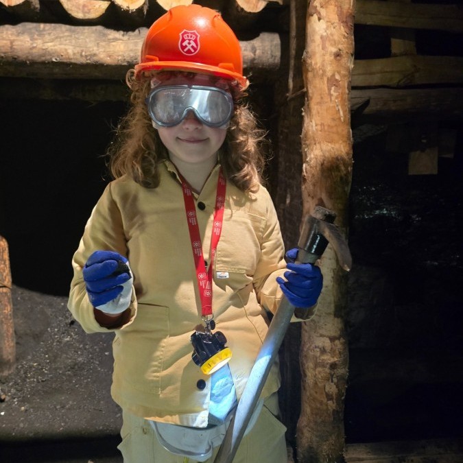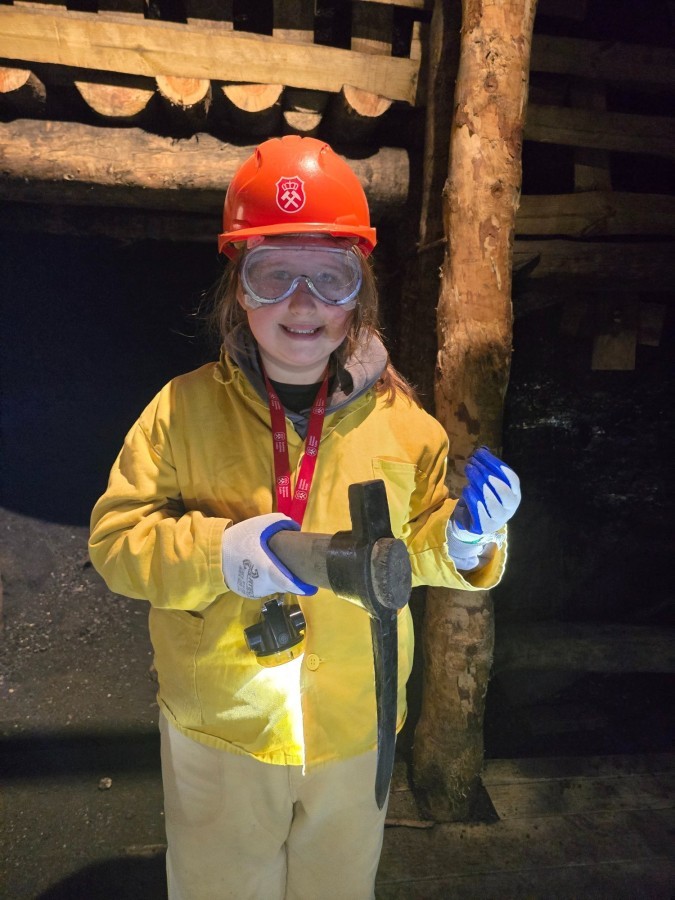 Ubrani w mundury i kaski czuliśmy się jak prawdziwi górnicy! Największą atrakcją było samodzielne kopanie węgla i praca kilofem 💪 Dodatkowo przecięliśmy kłodę piłą, uczyliśmy się udzielać pierwszej pomocy, a chodzenie górniczymi korytarzami było trochę straszne – podobno od dawna mieszka tam duch Skarbnika 👻