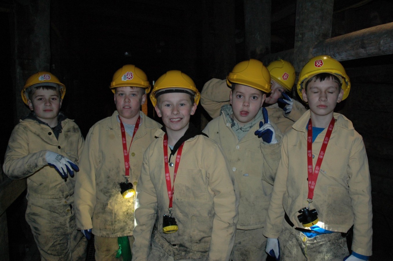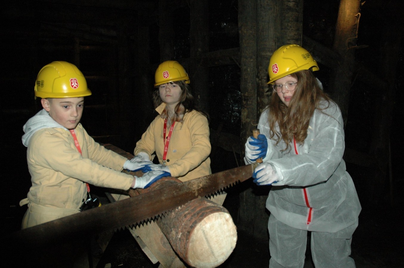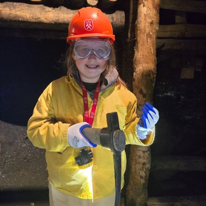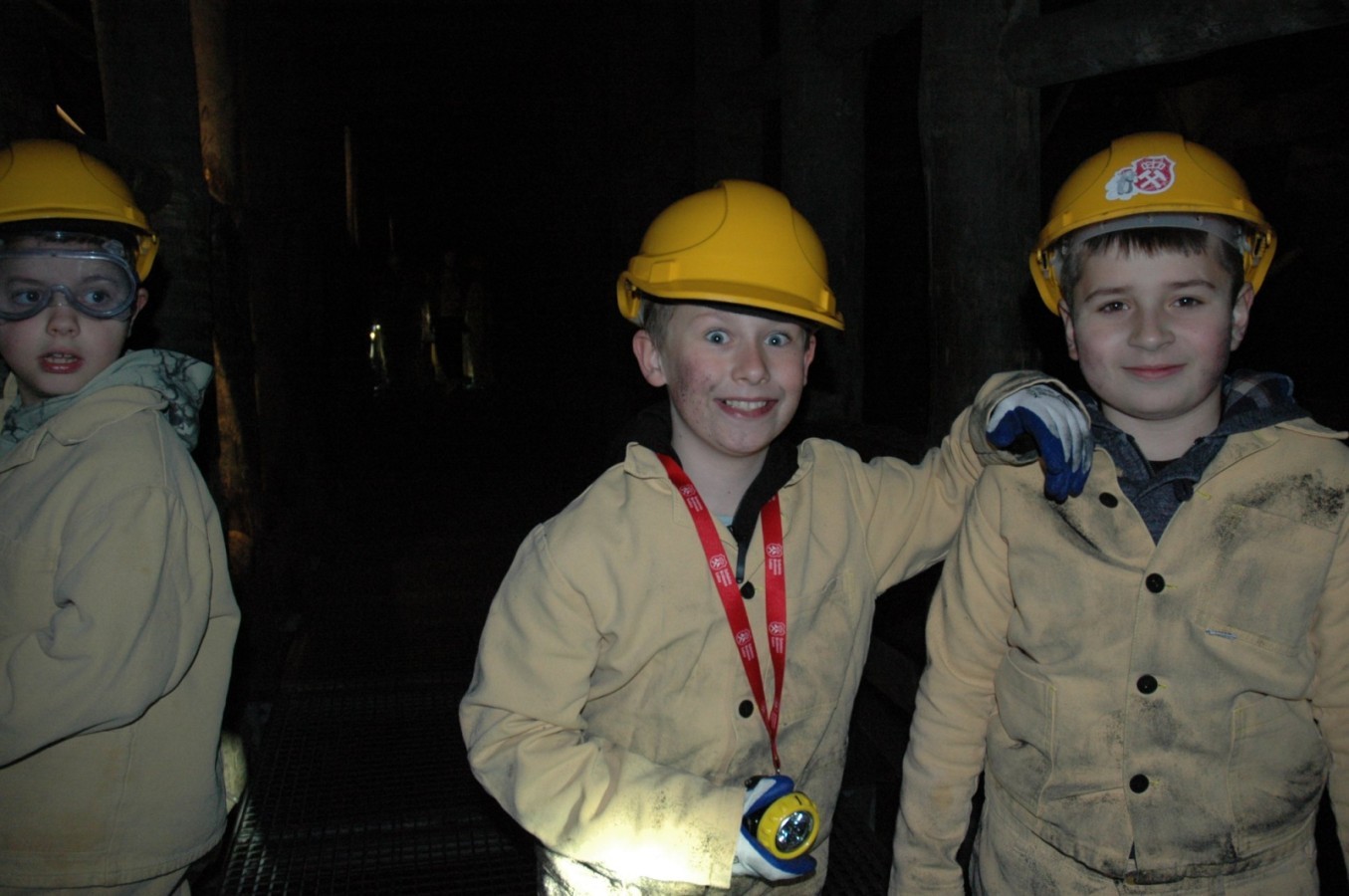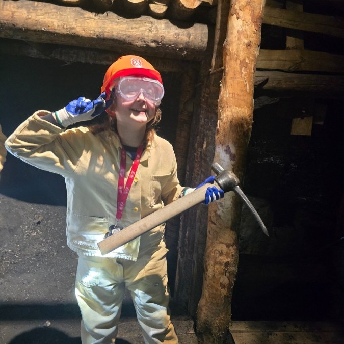 Ubrani w mundury i kaski czuliśmy się jak prawdziwi górnicy! Największą atrakcją było samodzielne kopanie węgla i praca kilofem 💪 Dodatkowo przecięliśmy kłodę piłą, uczyliśmy się udzielać pierwszej pomocy, a chodzenie górniczymi korytarzami było trochę straszne – podobno od dawna mieszka tam duch Skarbnika 👻