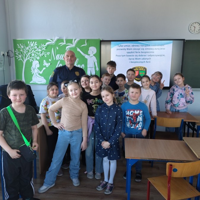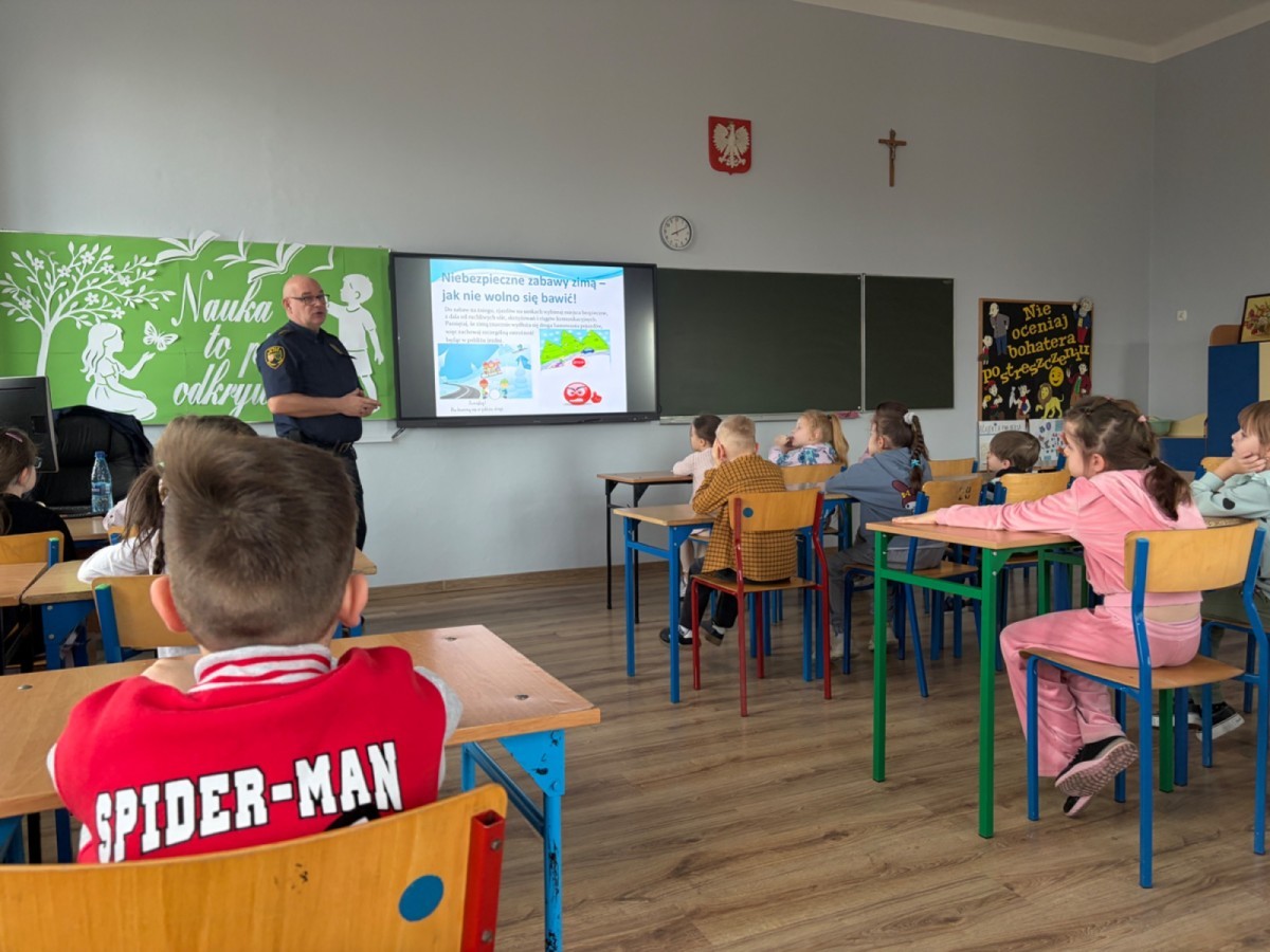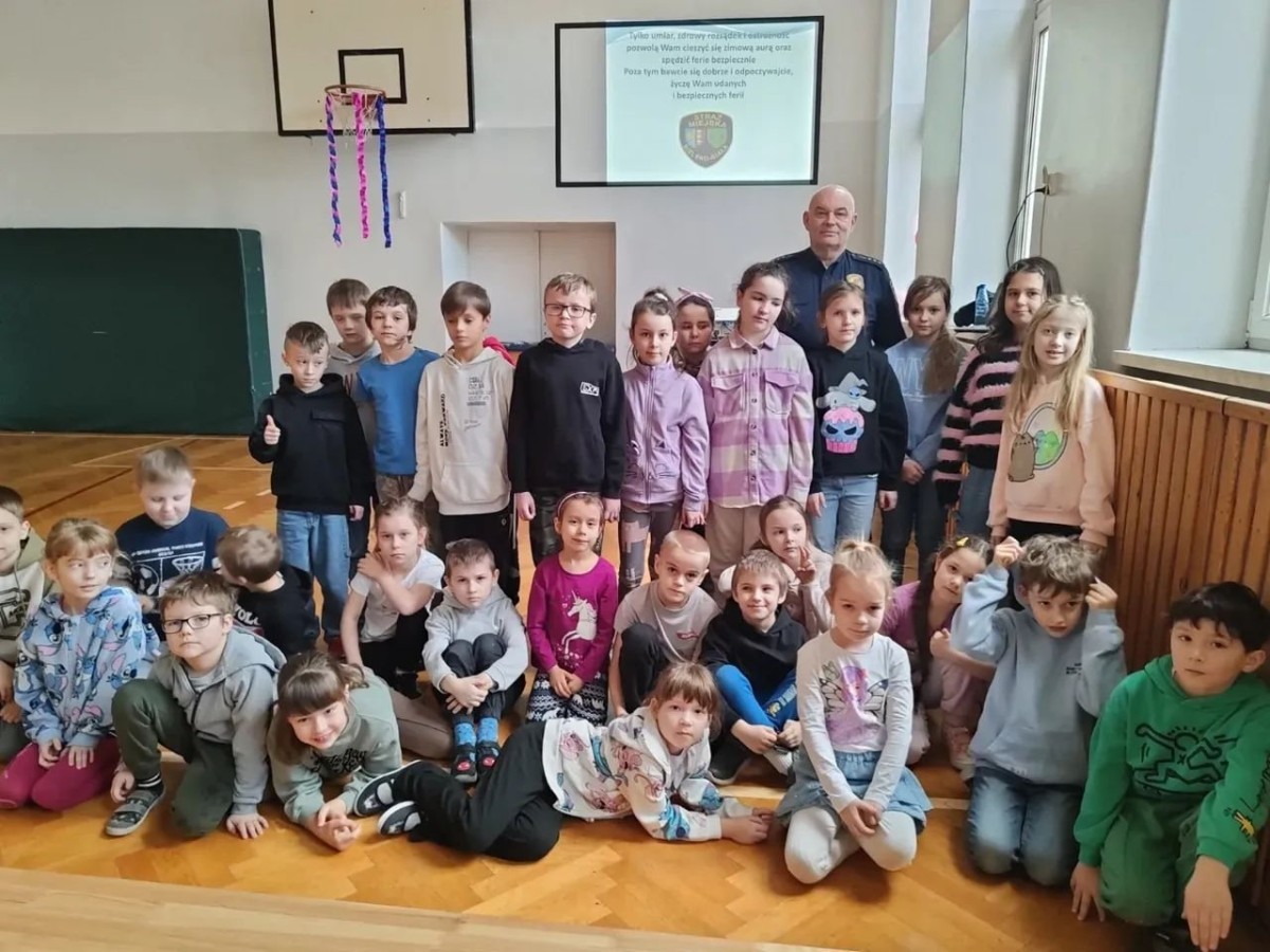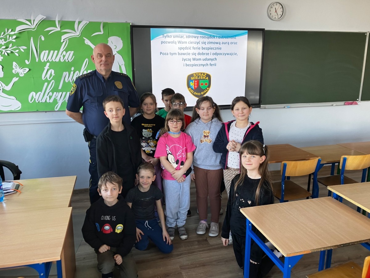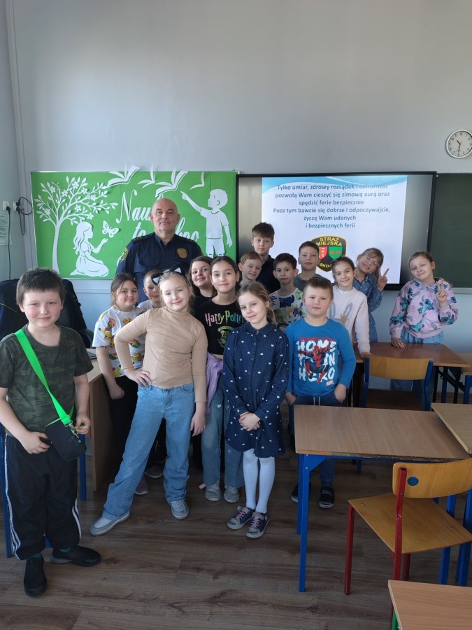 W związku ze zbliżającymi się feriami zimowymi uczniowie klas I–III wzięli udział w spotkaniu z przedstawicielem Straży Miejskiej. Podczas prelekcji dzieci dowiedziały się, jak bezpiecznie spędzać ferie zimowe – zarówno w domu, jak i podczas zabaw na świeżym powietrzu.