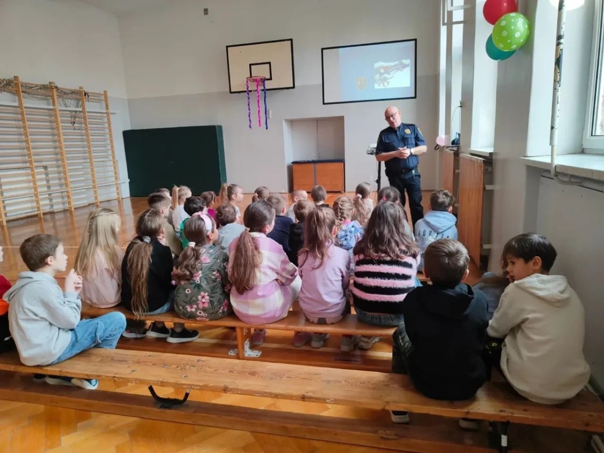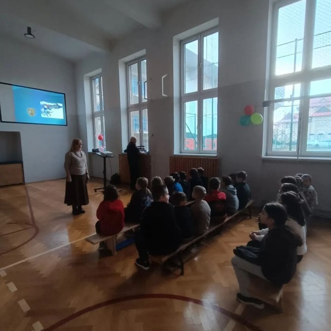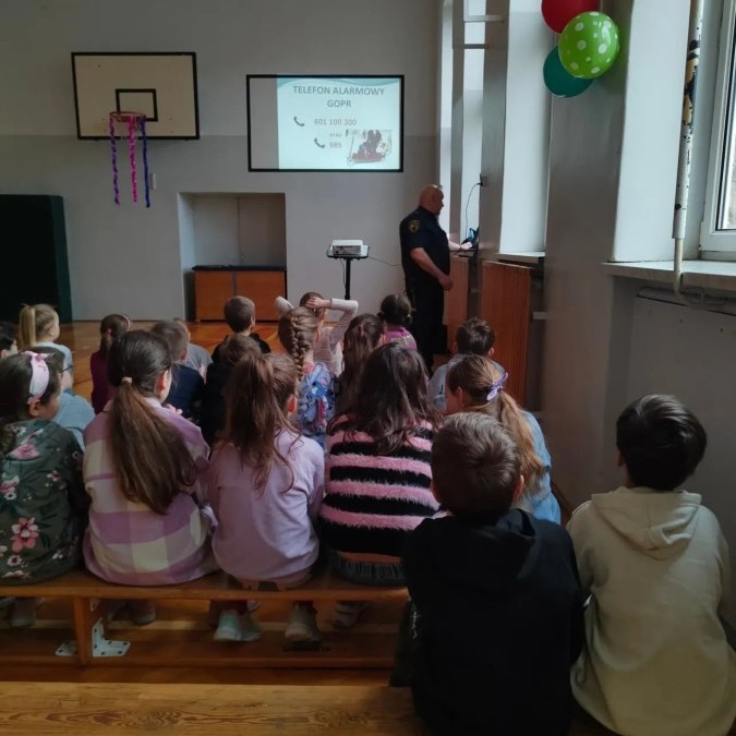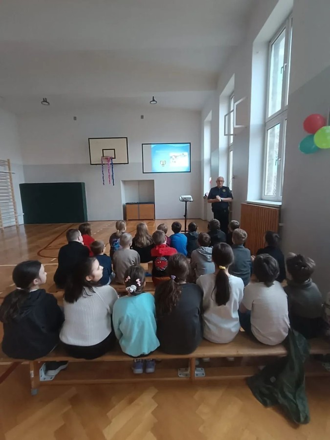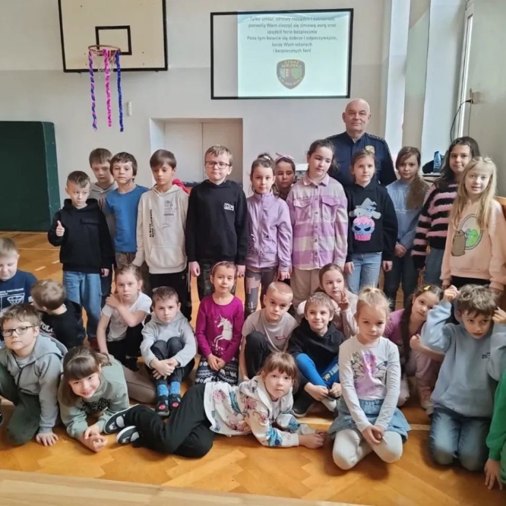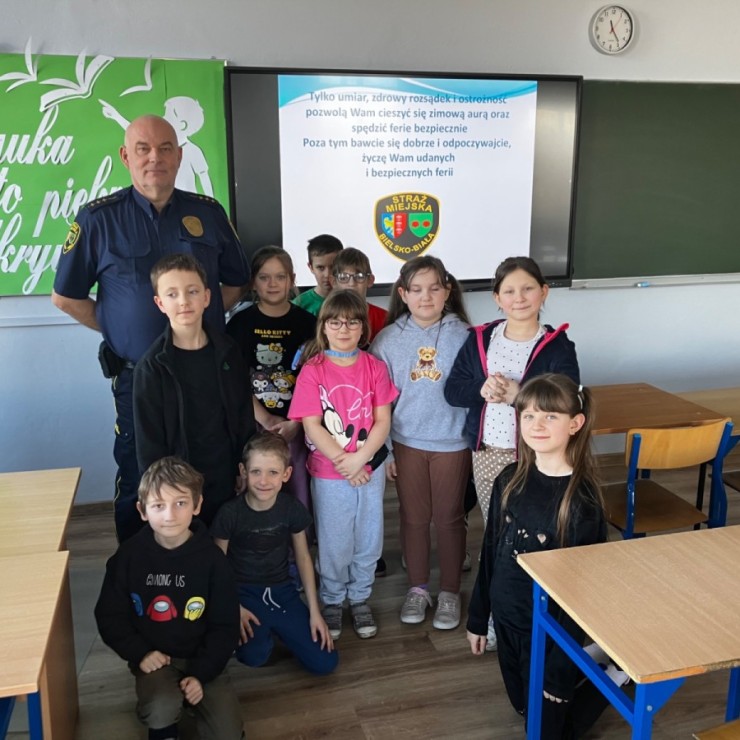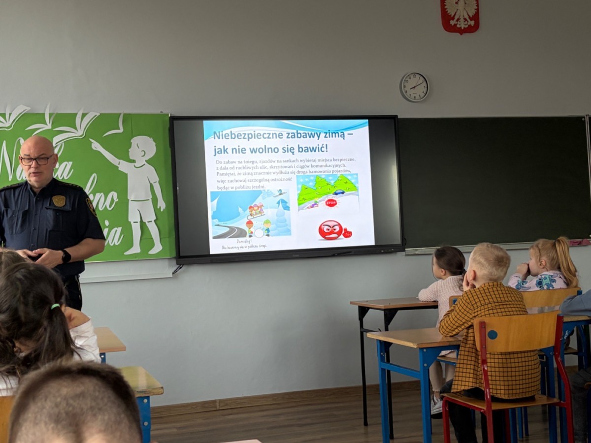W związku ze zbliżającymi się feriami zimowymi uczniowie klas I–III wzięli udział w spotkaniu z przedstawicielem Straży Miejskiej. Podczas prelekcji dzieci dowiedziały się, jak bezpiecznie spędzać ferie zimowe – zarówno w domu, jak i podczas zabaw na świeżym powietrzu.
