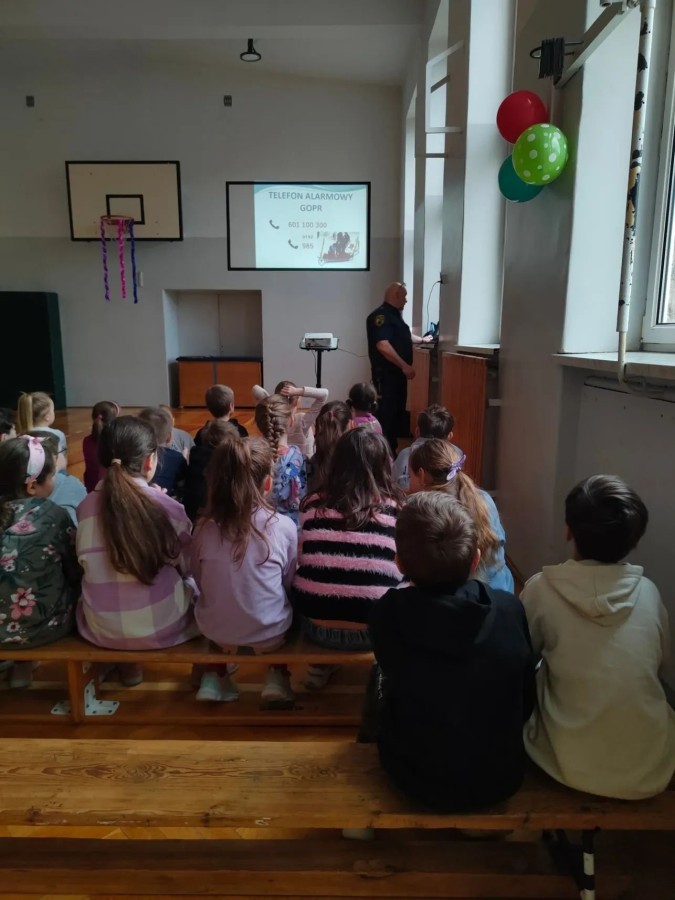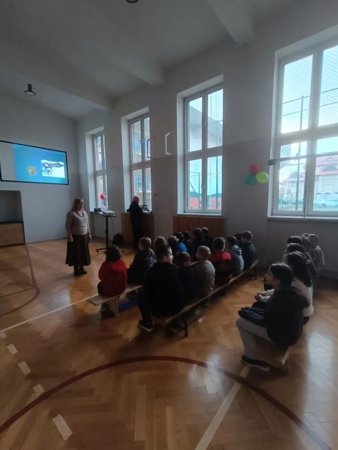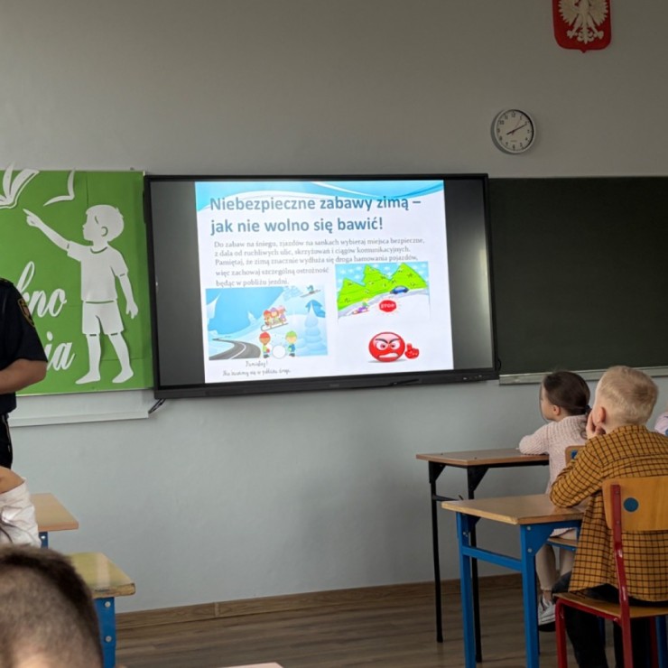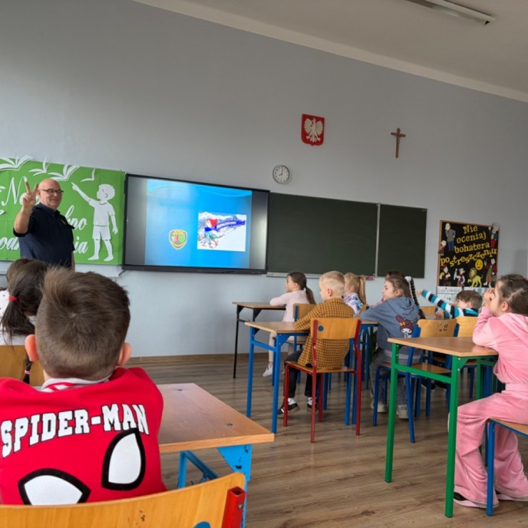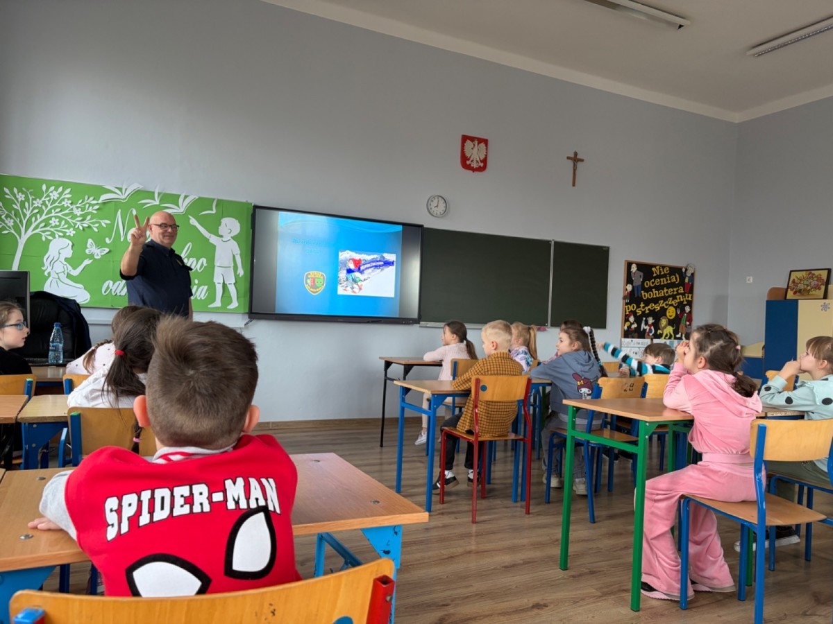 Uczniowie poznali zasady bezpiecznego zachowania podczas zimowych aktywności, przypomnieli sobie numery alarmowe oraz sposoby reagowania w sytuacjach zagrożenia. Spotkanie było prowadzone w przystępnej i angażującej formie, dostosowanej do wieku uczestników.