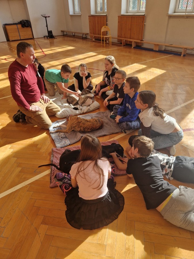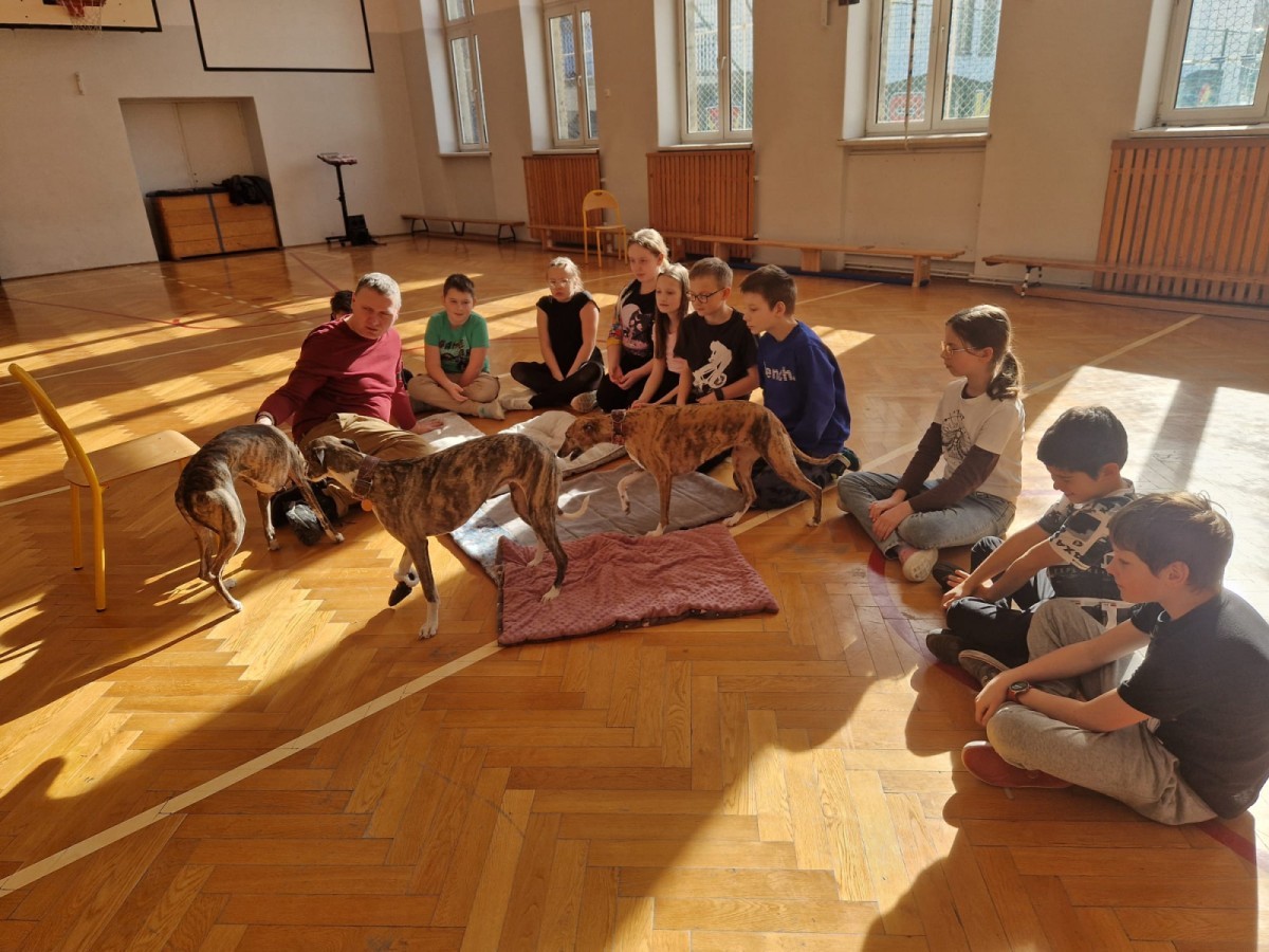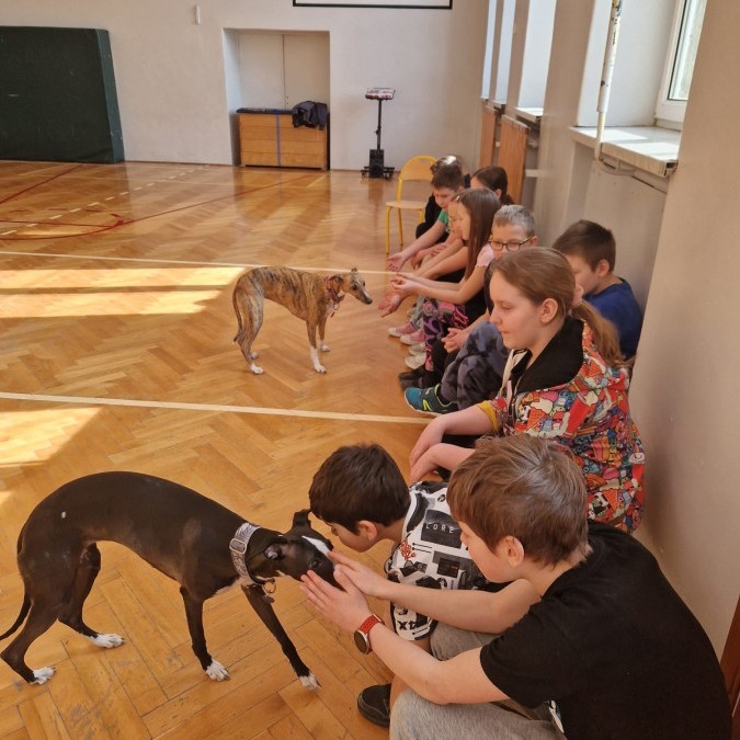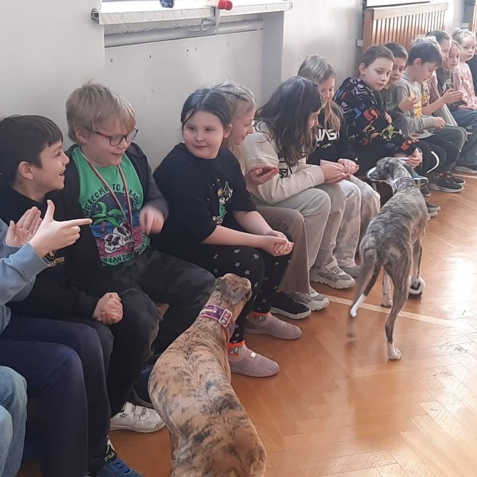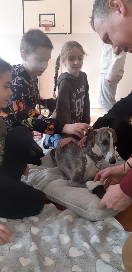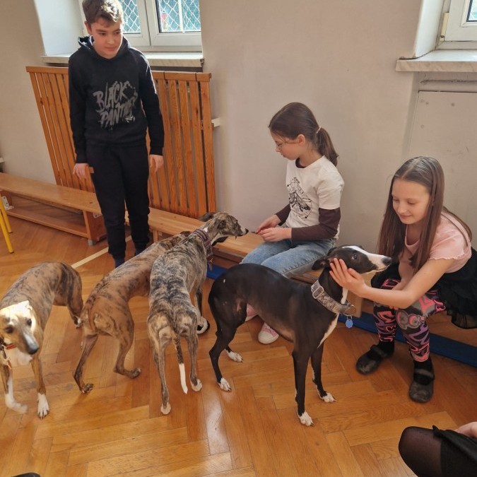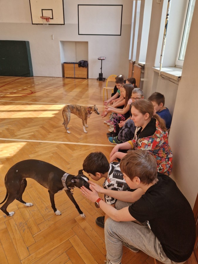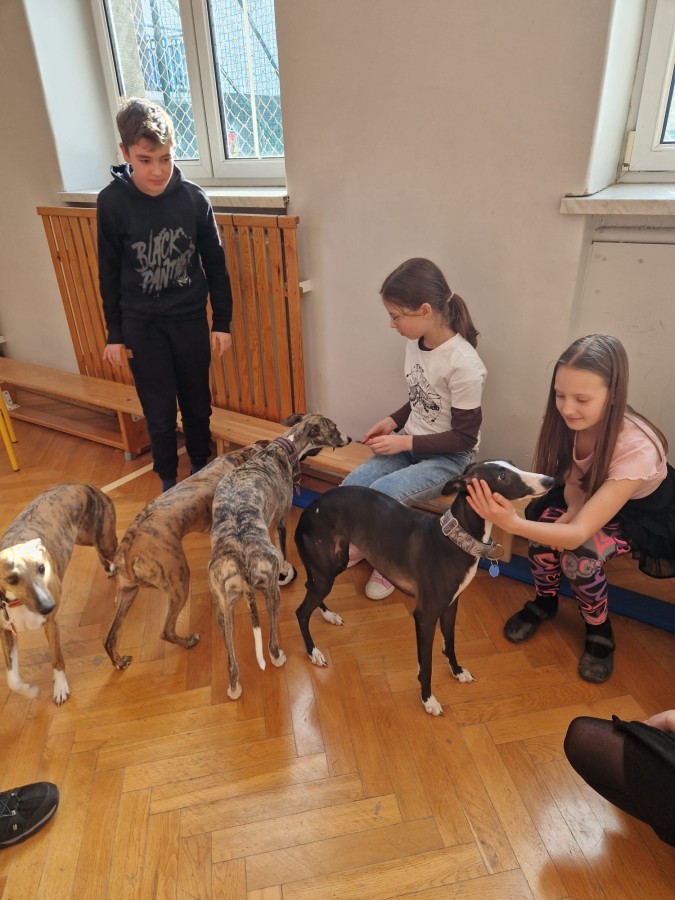Kolejnym punktem programu była dogoterapia. Dzieci dowiedziały się wielu ciekawych informacji o psach, ich zachowaniach i potrzebach. Największą atrakcją było wspólne spędzenie czasu z aż pięcioma chartami angielskimi!