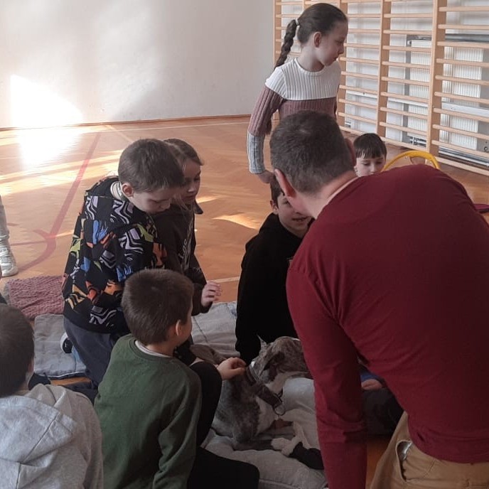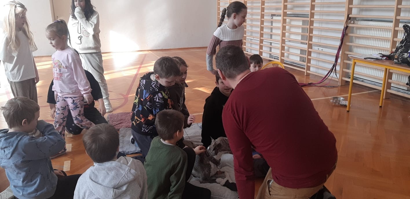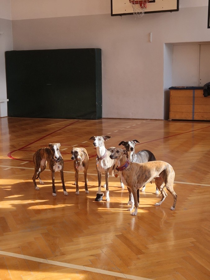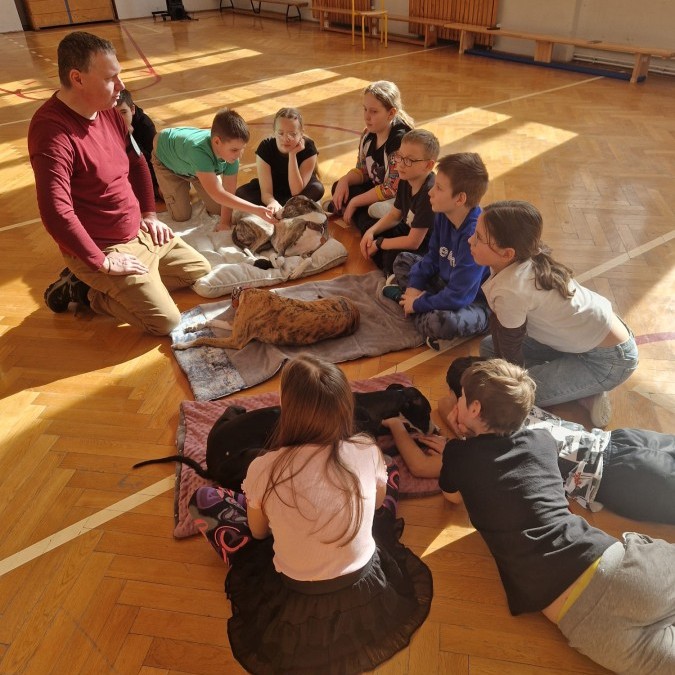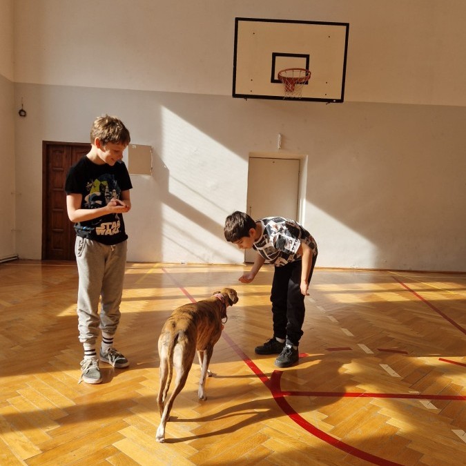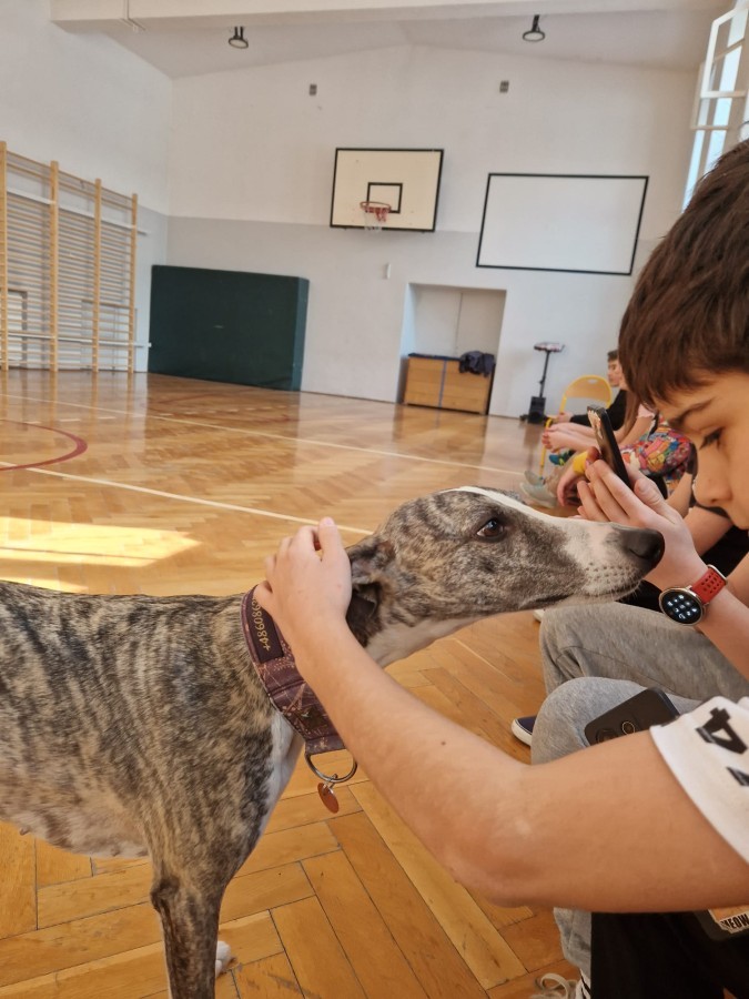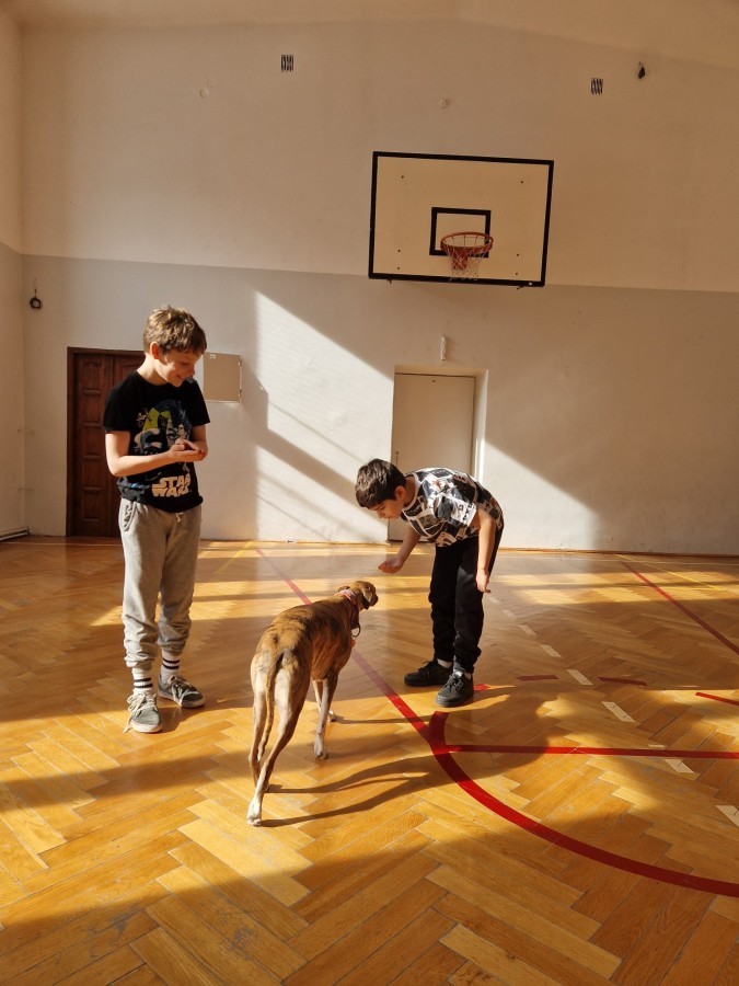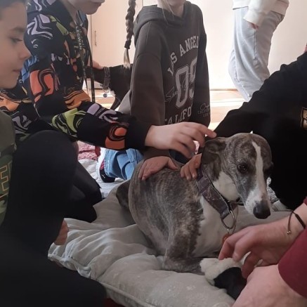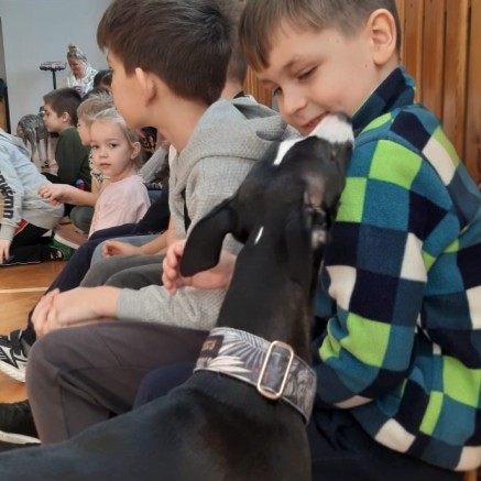 Kolejnym punktem programu była dogoterapia. Dzieci dowiedziały się wielu ciekawych informacji o psach, ich zachowaniach i potrzebach. Największą atrakcją było wspólne spędzenie czasu z aż pięcioma chartami angielskimi!