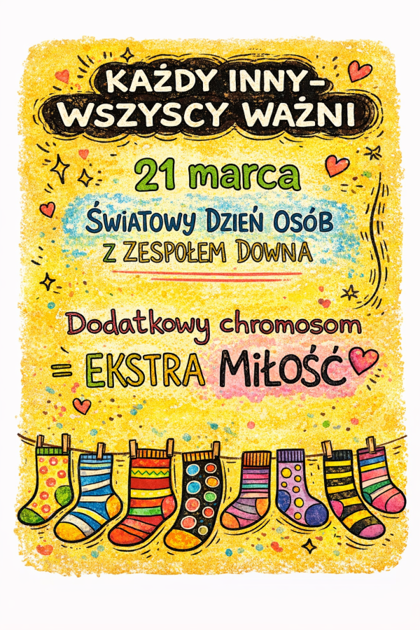 21 marca w naszej szkole obchodziliśmy Dzień Solidarności z Osobami z Zespołem Downa. Z tej okazji korytarze zostały udekorowane różnorodnymi, kolorowymi skarpetkami. Ta nietypowa instalacja przyciągała uwagę uczniów, skłaniając ich do refleksji oraz zadawania pytań: dlaczego właśnie skarpetki i co one symbolizują. Była to doskonała okazja do rozmów o akceptacji, różnorodności i solidarności z innymi.