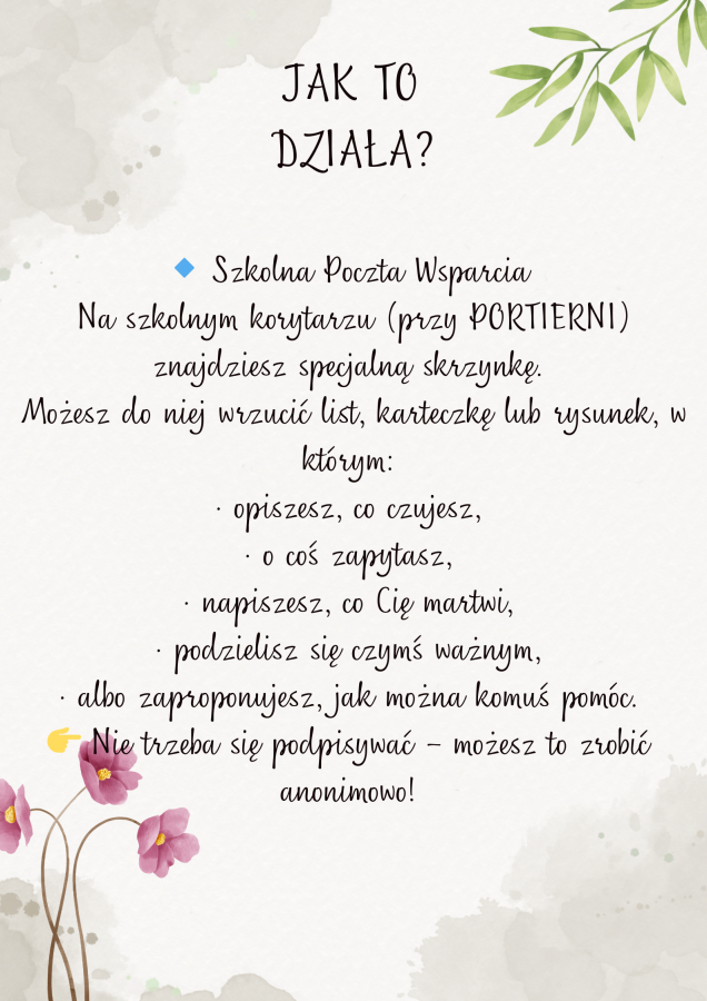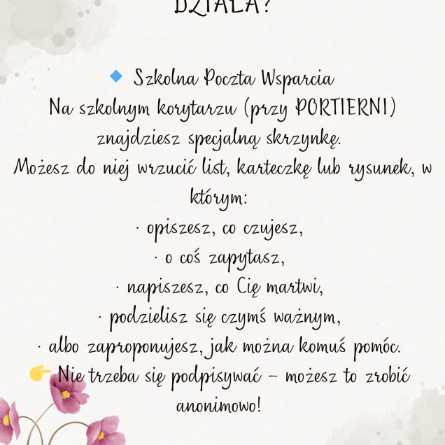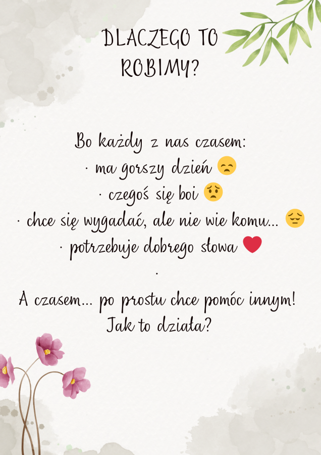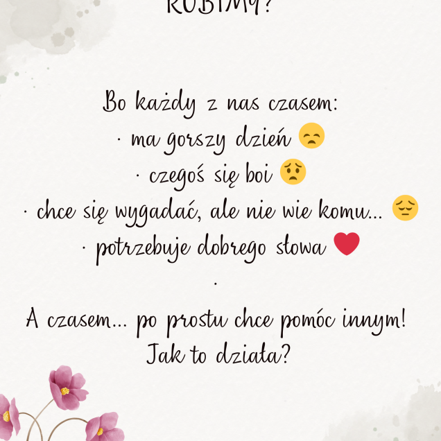 Dzieci i młodzież mogą wrzucać do niej listy, w których dzielą się swoimi myślami, troskami, pytaniami – wszystkim tym, czego nie zawsze łatwo powiedzieć na głos. A my? Jesteśmy tu, by słuchać. By być wsparciem. By pokazać, że nigdy nie są sami.
