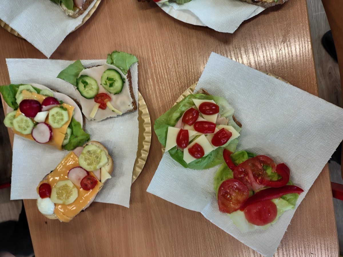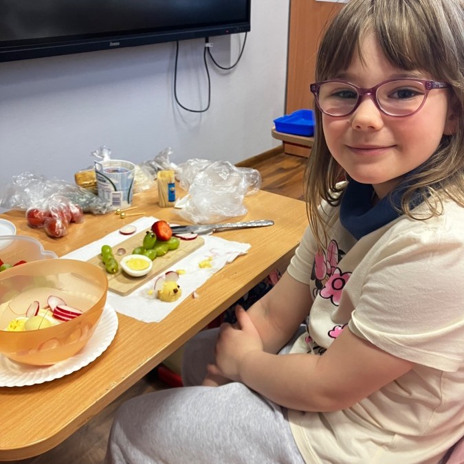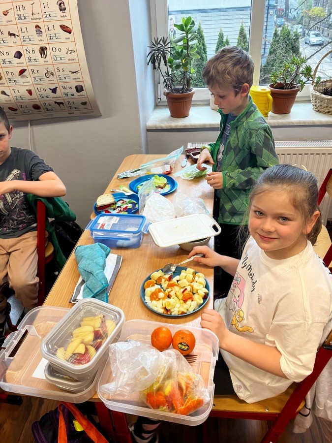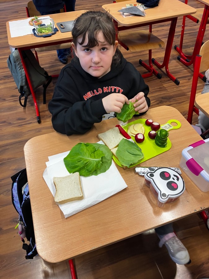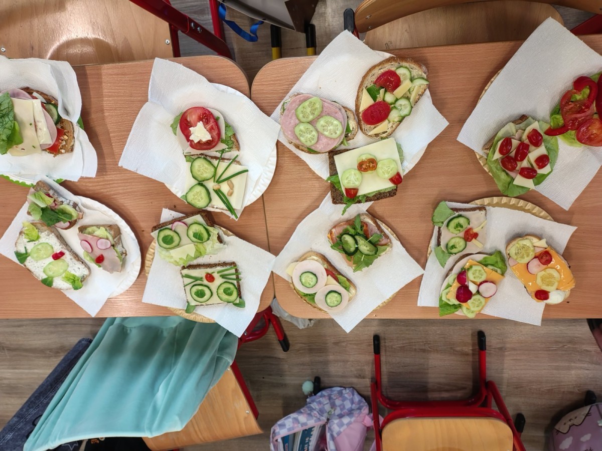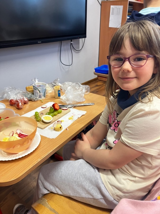 Dzieci z zaangażowaniem przygotowały zdrowe i smaczne przekąski. Na stołach pojawiły się kanapki, owoce, warzywa oraz różnorodne przysmaki. Wspólne spożywanie posiłku było okazją do rozmów, uśmiechu i miłego spędzenia czasu w przyjaznej atmosferze.