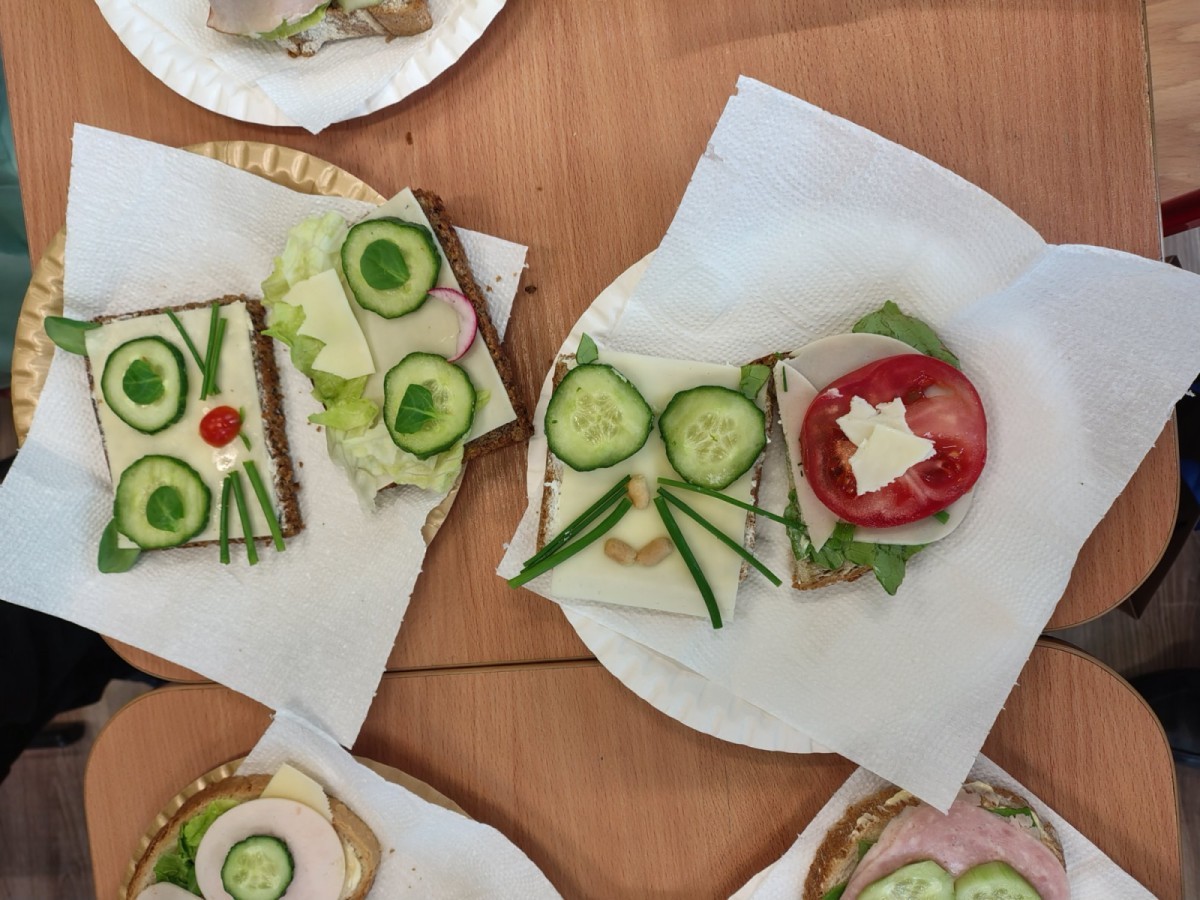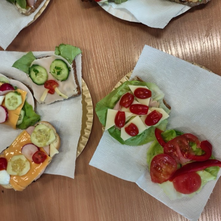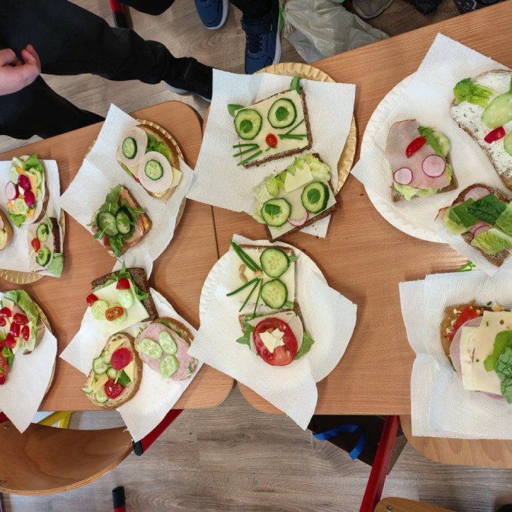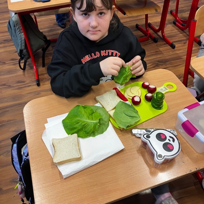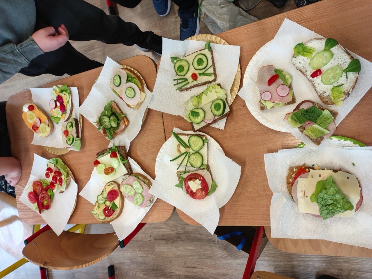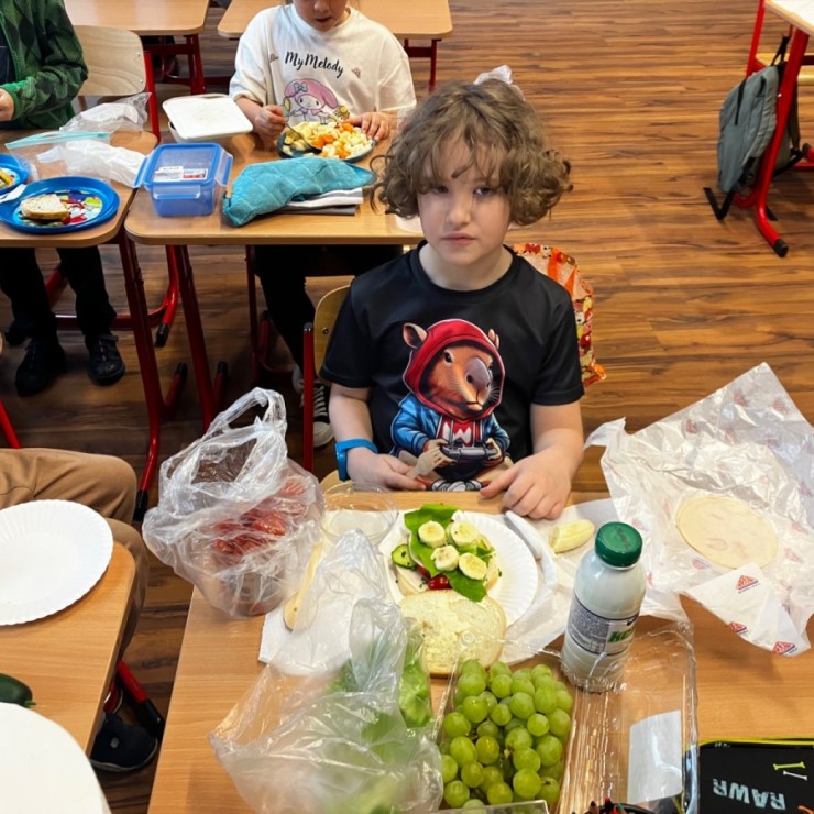 Dzieci z zaangażowaniem przygotowały zdrowe i smaczne przekąski. Na stołach pojawiły się kanapki, owoce, warzywa oraz różnorodne przysmaki. Wspólne spożywanie posiłku było okazją do rozmów, uśmiechu i miłego spędzenia czasu w przyjaznej atmosferze.