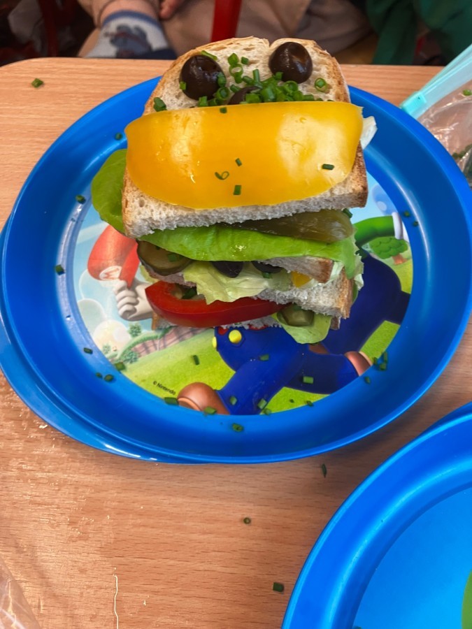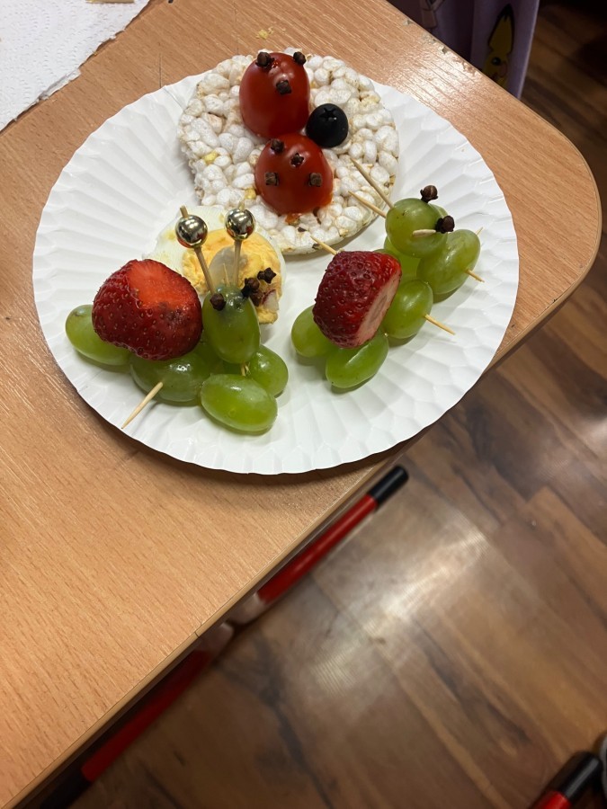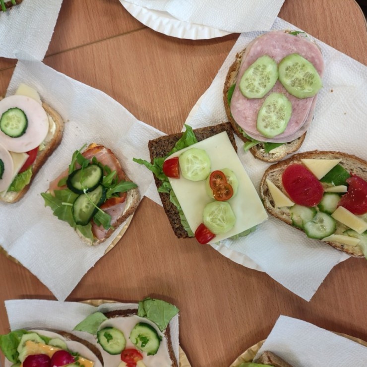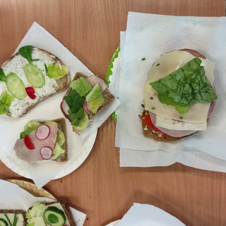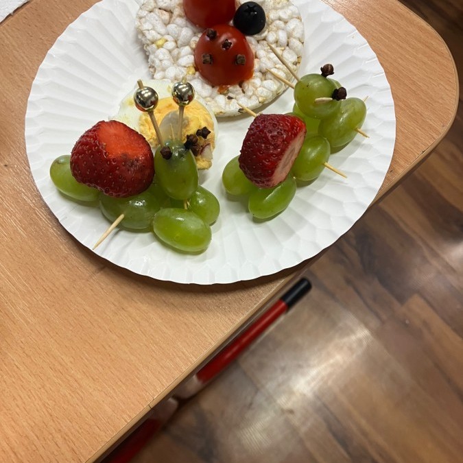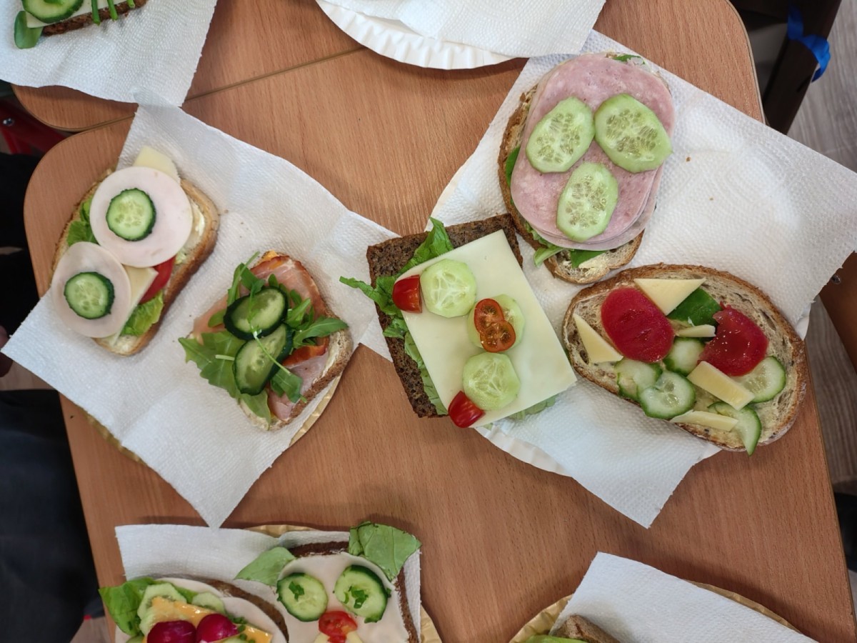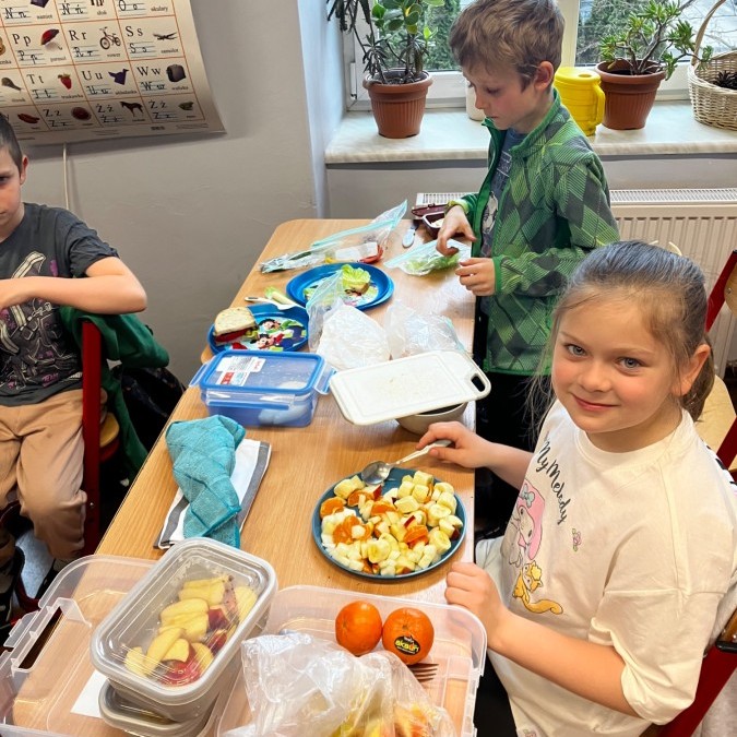 Dzieci z zaangażowaniem przygotowały zdrowe i smaczne przekąski. Na stołach pojawiły się kanapki, owoce, warzywa oraz różnorodne przysmaki. Wspólne spożywanie posiłku było okazją do rozmów, uśmiechu i miłego spędzenia czasu w przyjaznej atmosferze.