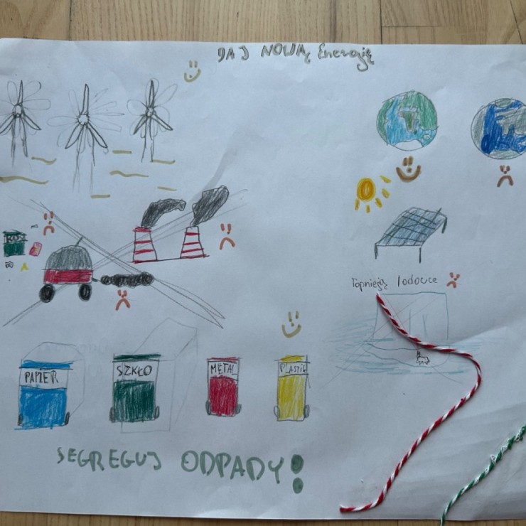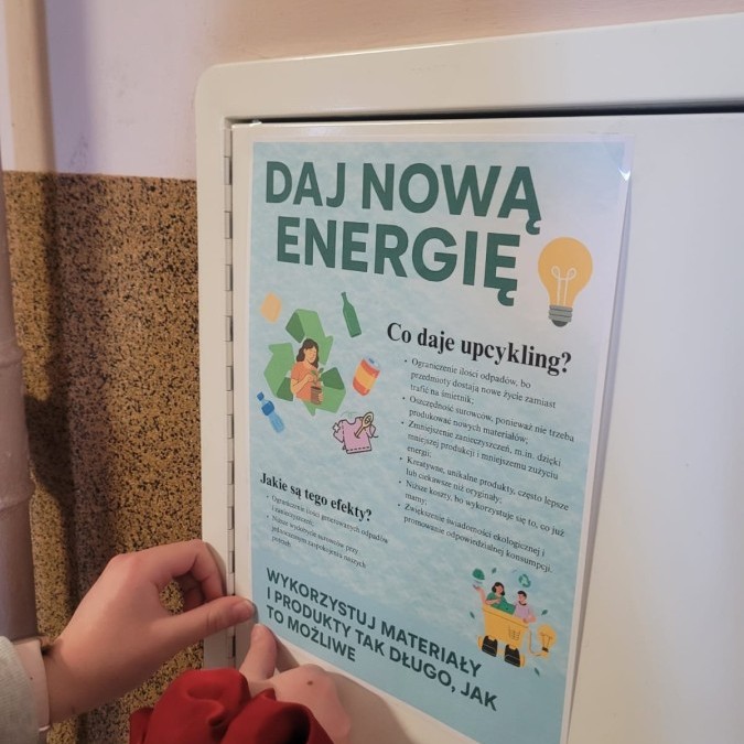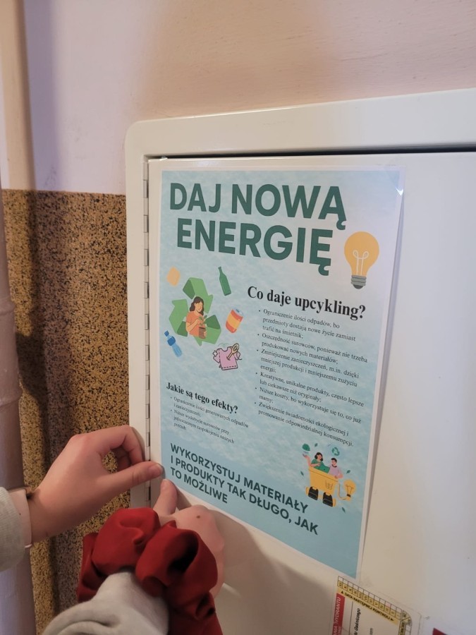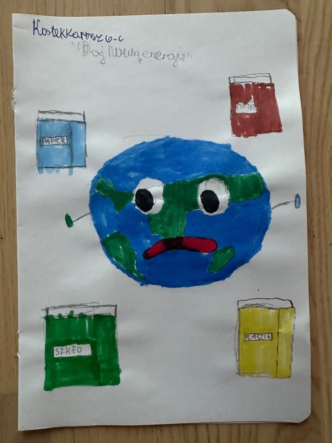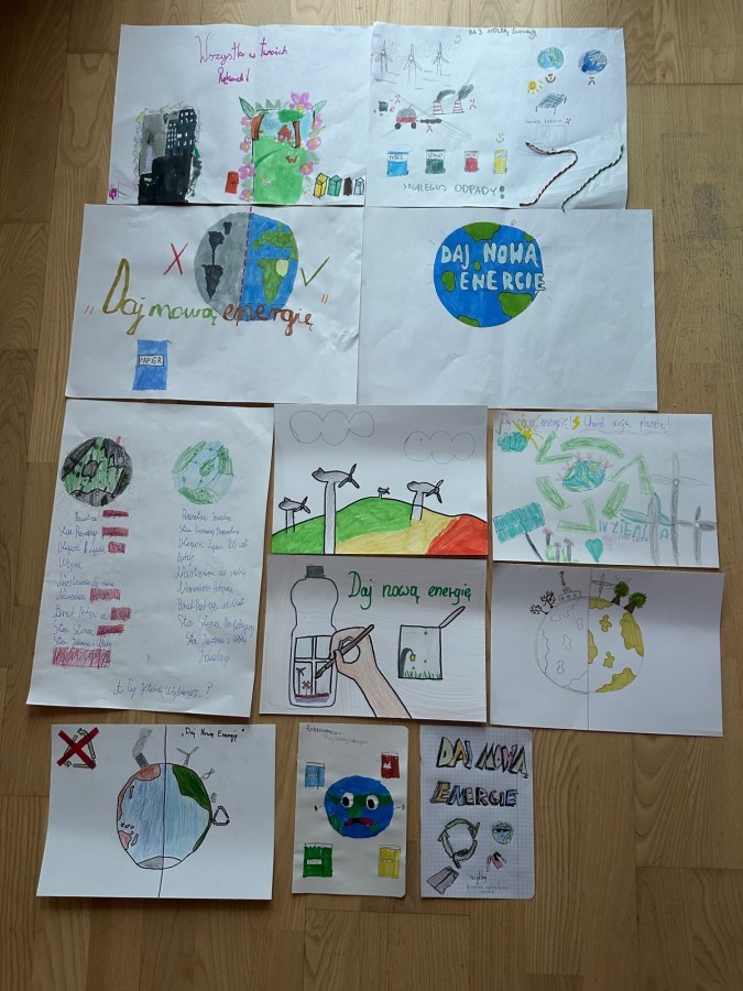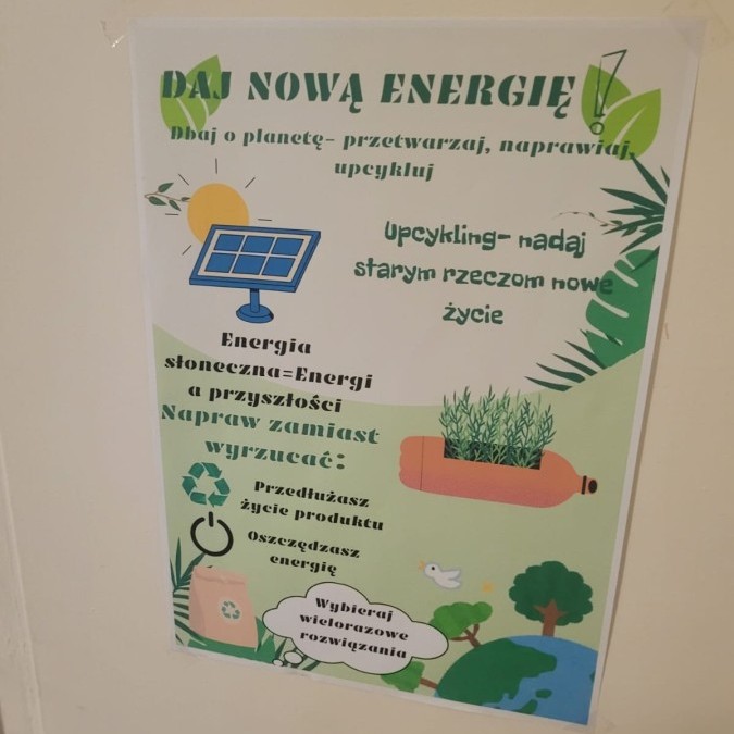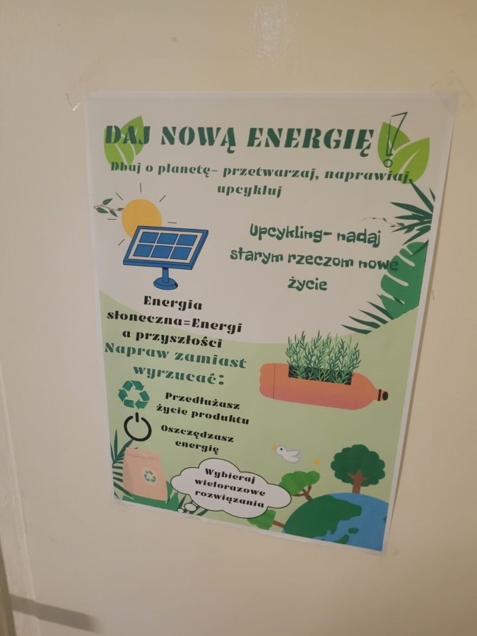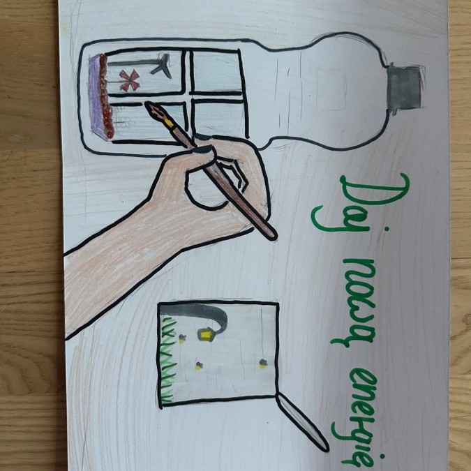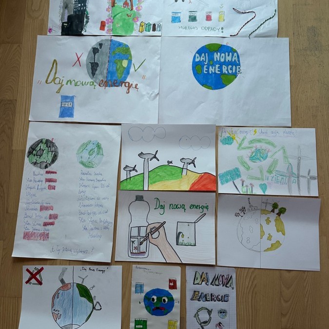 Uczniowie, biorąc udział w konkursie „Szanuj energię, chroń klimat”, po raz kolejny włączyli się w twórcze działania, tworząc plakaty edukacyjne o tematyce ekologicznej. W swoich pracach zwrócili szczególną uwagę na hasło przewodnie tegorocznej edycji – „Daj nową energię”, a także na ideę upcyklingu, podkreślając znaczenie ponownego wykorzystania materiałów i odpowiedzialnego gospodarowania zasobami. Pomysłowość, kolor i ważny przekaz – brawo za zaangażowanie!