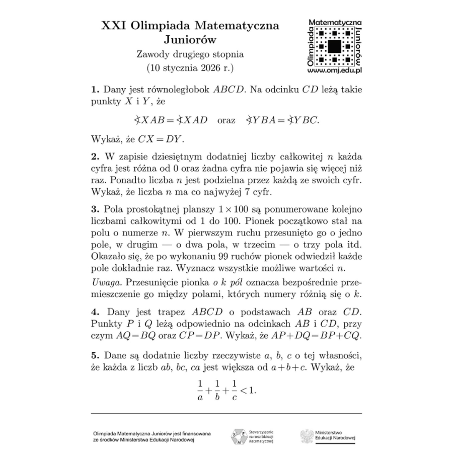W galerii dostępnej poniżej znajdują się zadania z II etapu Olimpiady Matematycznej Juniorów. Zachęcamy do zapoznania się z nimi, aby zobaczyć, jak wymagające wyzwania stoją przed najlepszymi młodymi matematykami w Polsce.