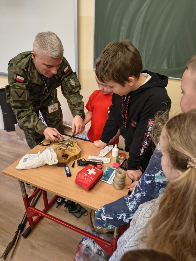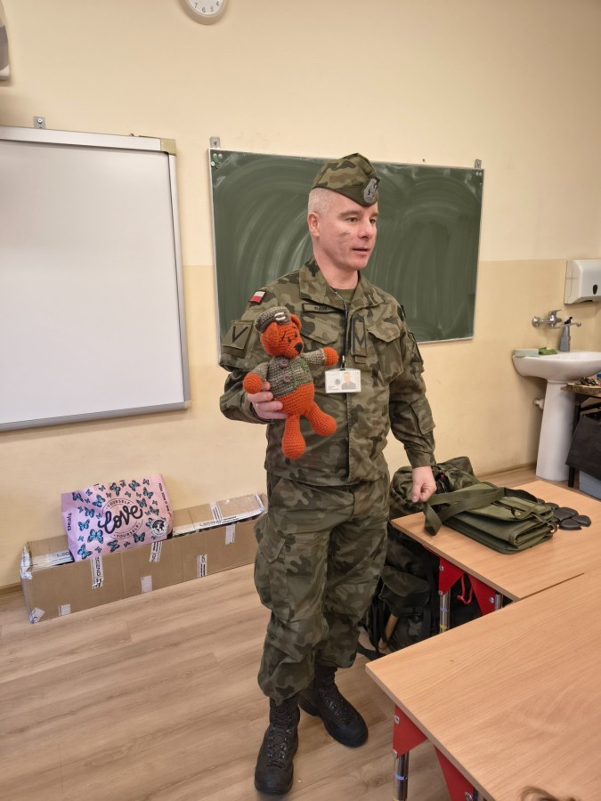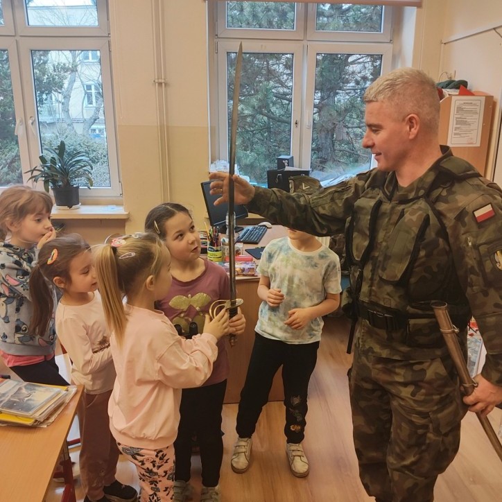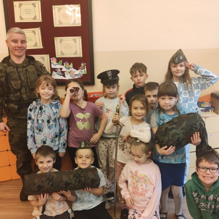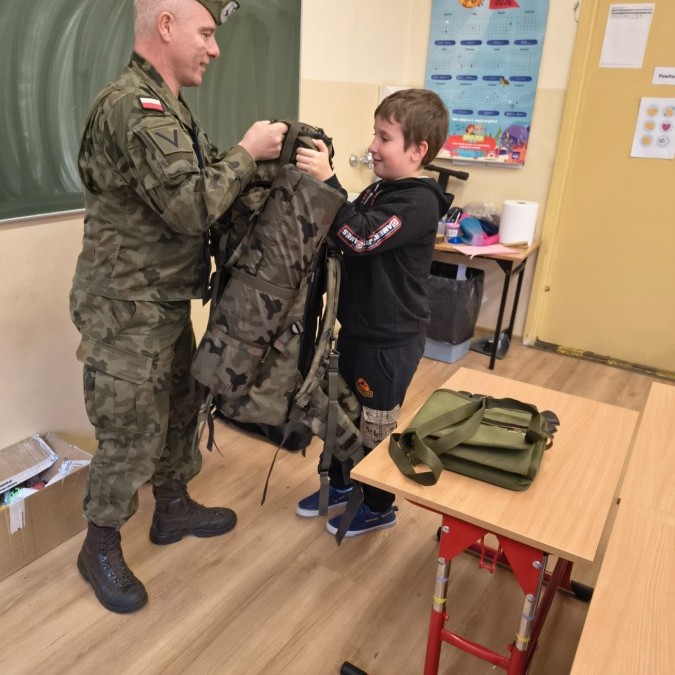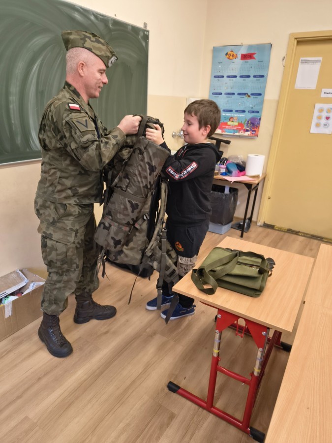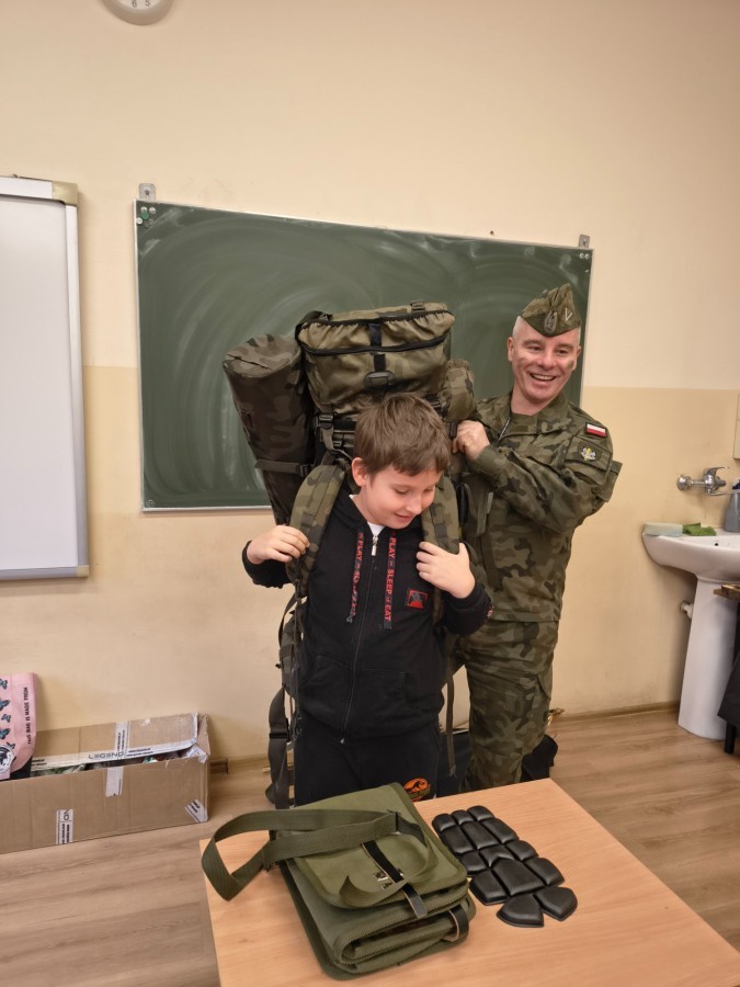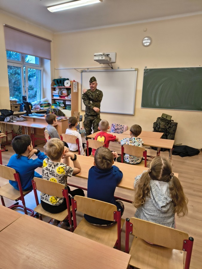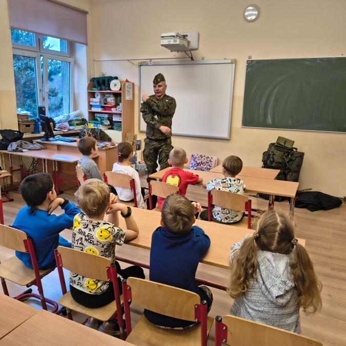 Pan Krzysztof z ogromnym zaangażowaniem opowiadał o swojej pracy w wojsku, przybliżając uczniom, na czym polega służba żołnierza oraz jak ważne są odwaga, odpowiedzialność i współpraca w zespole. Dzieci miały okazję z bliska obejrzeć różne rodzaje umundurowania – zarówno mundur moro używany w terenie, jak i elegancki mundur galowy zakładany podczas uroczystości.