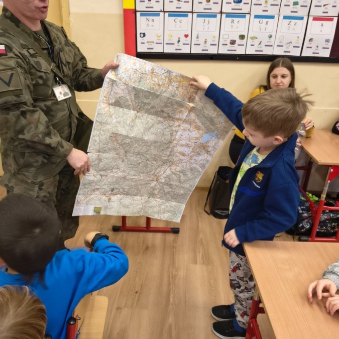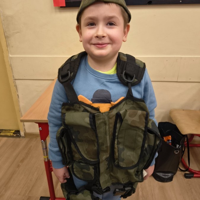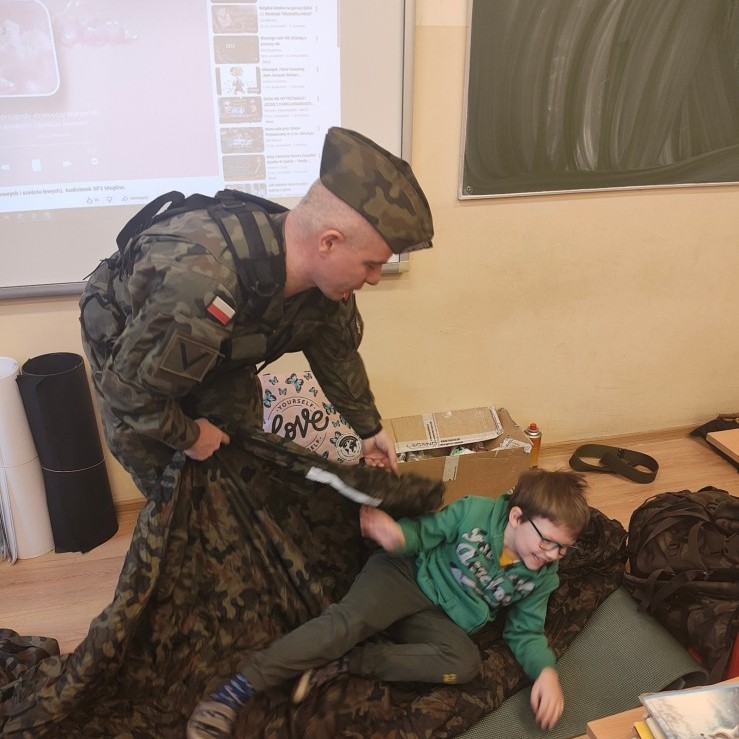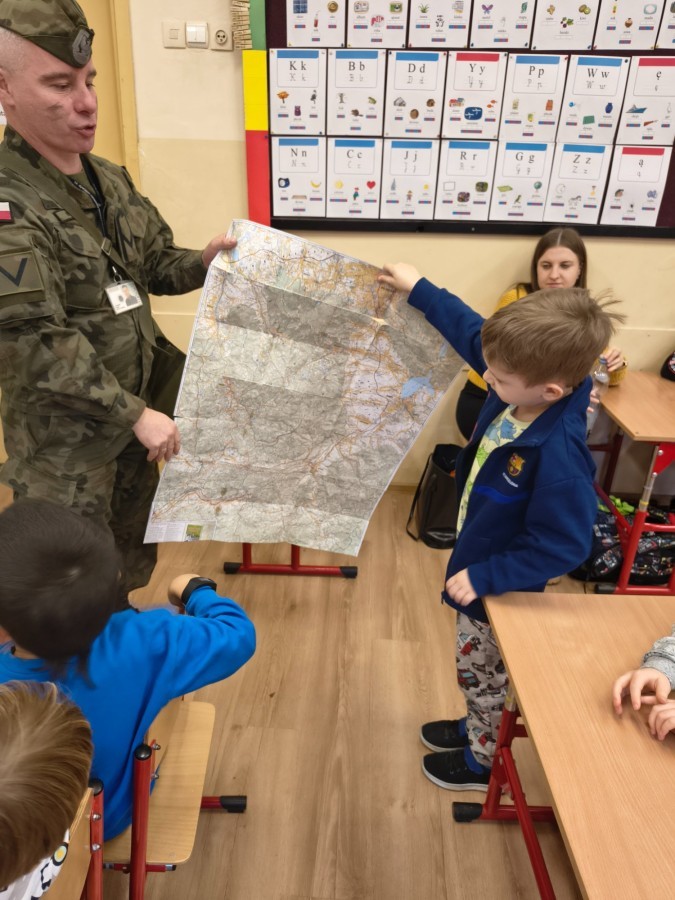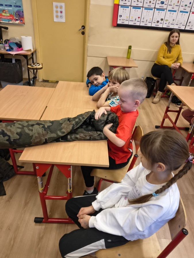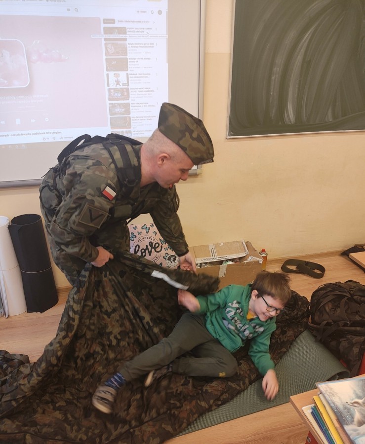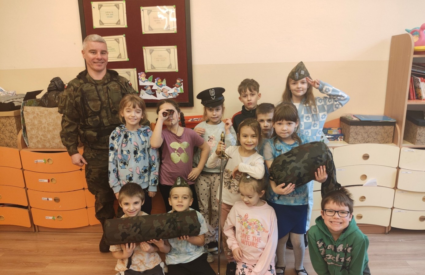 Pan Krzysztof z ogromnym zaangażowaniem opowiadał o swojej pracy w wojsku, przybliżając uczniom, na czym polega służba żołnierza oraz jak ważne są odwaga, odpowiedzialność i współpraca w zespole. Dzieci miały okazję z bliska obejrzeć różne rodzaje umundurowania – zarówno mundur moro używany w terenie, jak i elegancki mundur galowy zakładany podczas uroczystości.