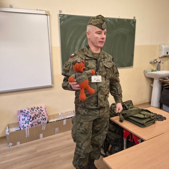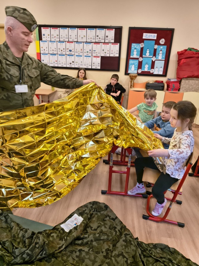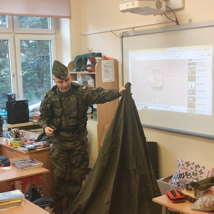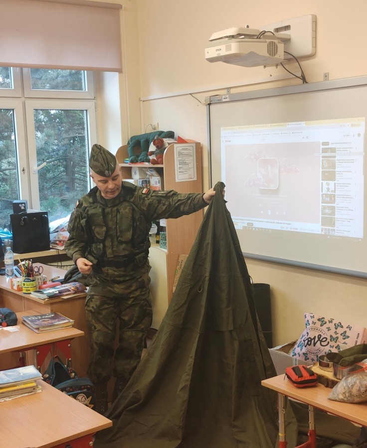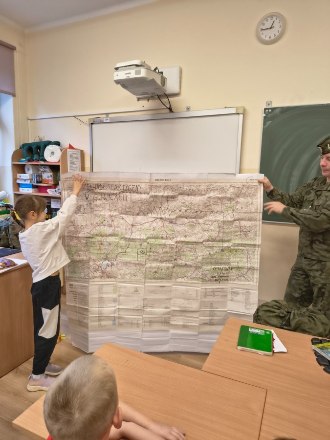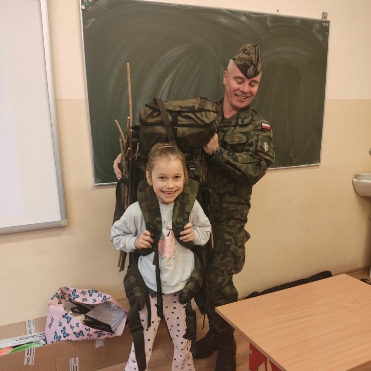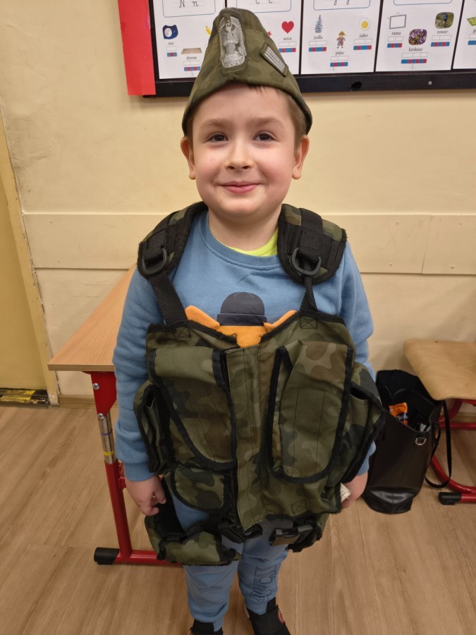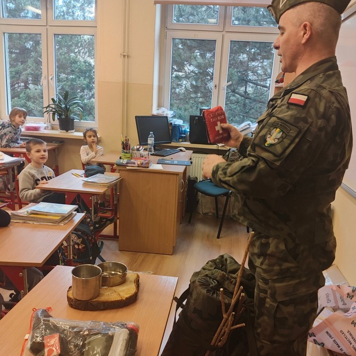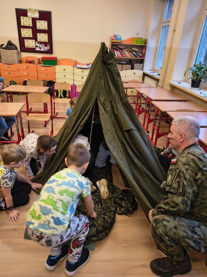 Pan Krzysztof z ogromnym zaangażowaniem opowiadał o swojej pracy w wojsku, przybliżając uczniom, na czym polega służba żołnierza oraz jak ważne są odwaga, odpowiedzialność i współpraca w zespole. Dzieci miały okazję z bliska obejrzeć różne rodzaje umundurowania – zarówno mundur moro używany w terenie, jak i elegancki mundur galowy zakładany podczas uroczystości.