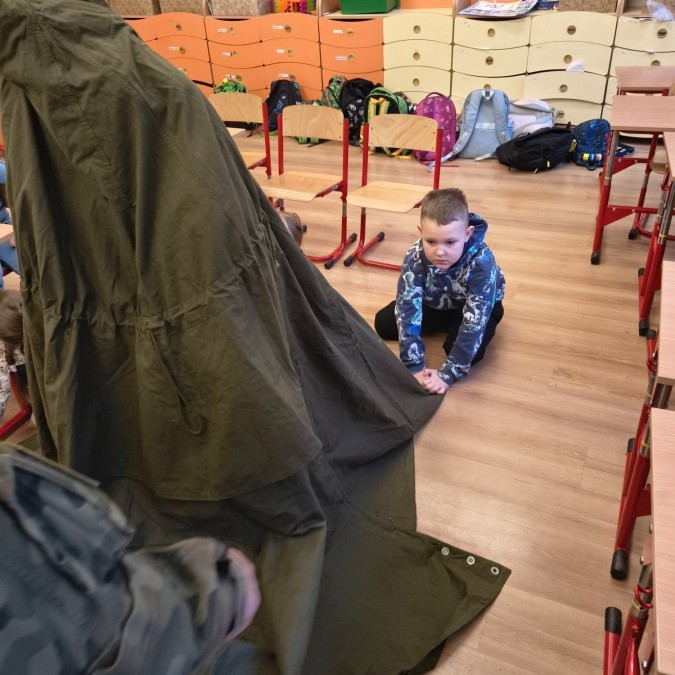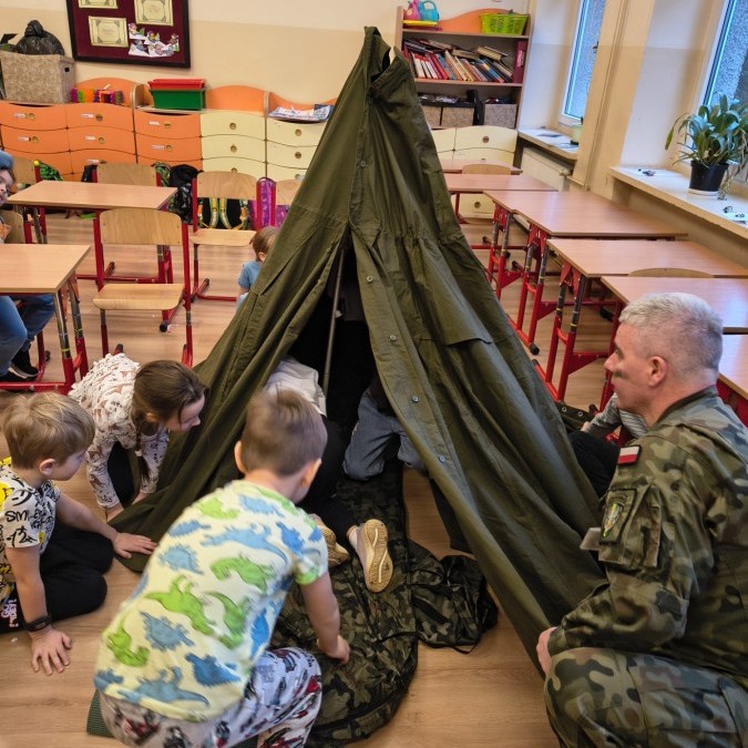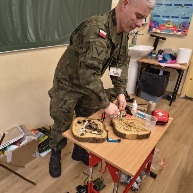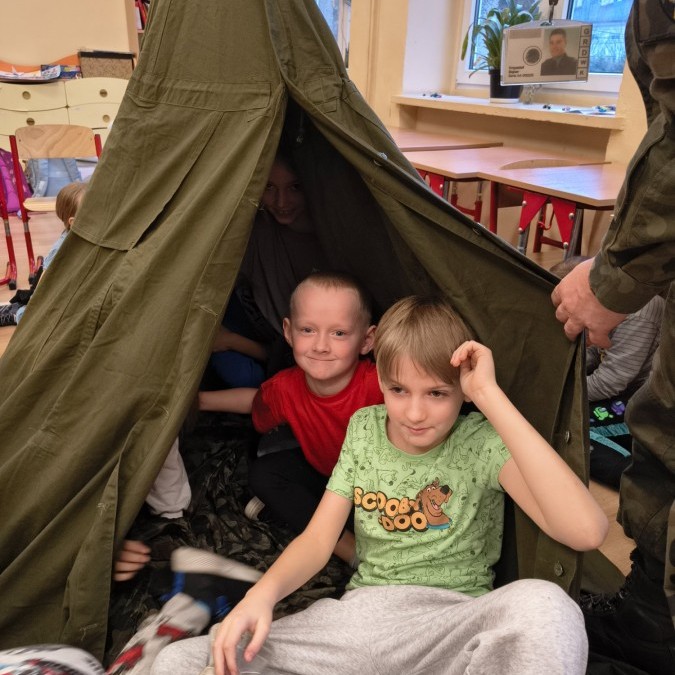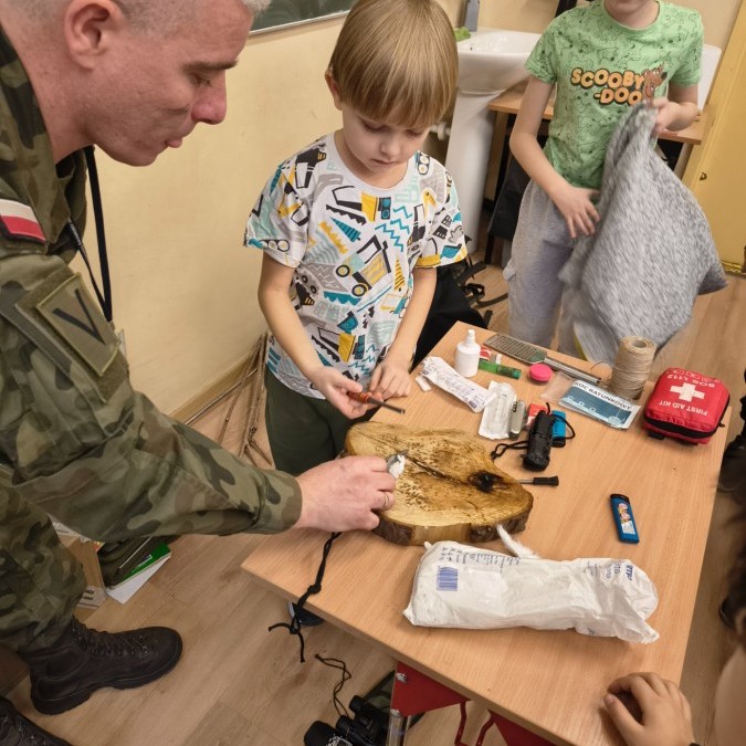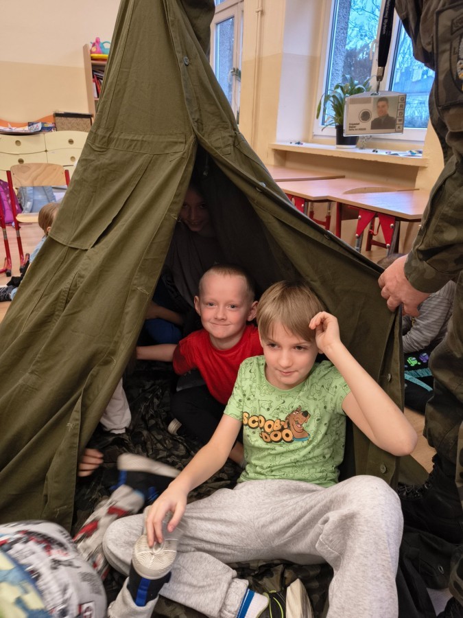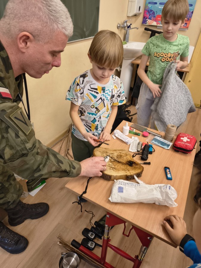 Największe emocje wzbudziła jednak część praktyczna spotkania. Uczniowie dowiedzieli się, jak radzić sobie w trudnych warunkach terenowych i co jest najważniejsze podczas przebywania w lesie czy na biwaku. Pod czujnym okiem gościa dzieci mogły spróbować rozpalić ogień przy użyciu krzesiwa oraz wspólnie rozłożyć namiot. Była to nie tylko świetna zabawa, ale także cenna lekcja samodzielności, cierpliwości i współdziałania.