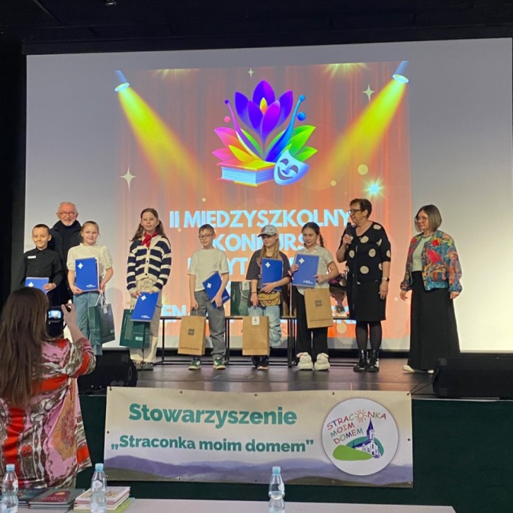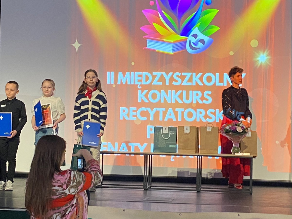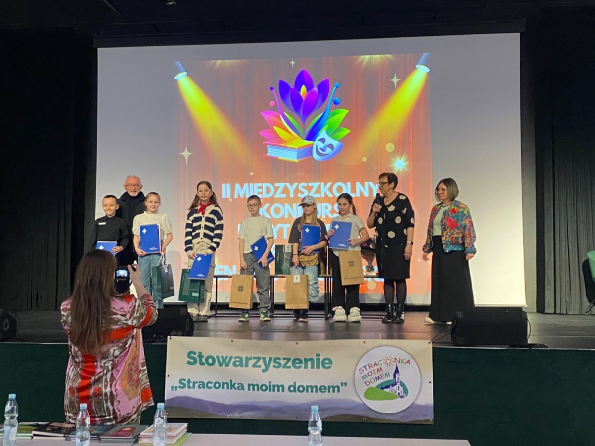 9 marca w Domu Kultury w Straconce odbył się II Międzyszkolny Konkurs Recytatorski. Zadaniem uczniów było wyrecytowanie 4-minutowego fragmentu prozy Pani Renaty Piątkowskiej. W konkursie udział wzięli uczniowie z bielskich szkół. Naszą szkołę reprezentowała uczennica klasy 4c - Karolina Zaitz. W ocenie brano pod uwagę: dobór i opanowanie pamięciowe tekstu, interpretację utworu, dykcję i ogólny wyraz artystyczny. W jury zasiadła sama Renata Piątkowska! Dlatego z ogromną radością ogłaszamy, że I miejsce zajęła właśnie nasza uczennica – Karolina Zaitz, która fenomenalnie wyrecytowała fragment opowiadania "Skrzydlaty kurier" ze zbioru pt. "Oko w oko ze zwierzakiem".