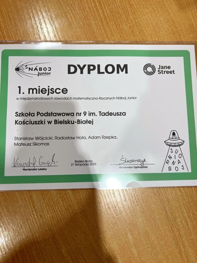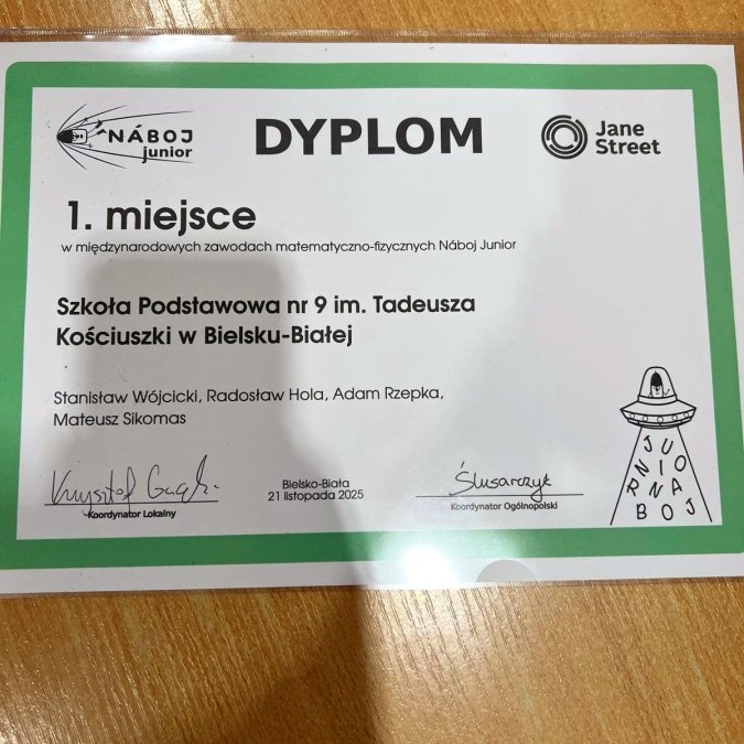 Uczniowie naszej szkoły wzięli udział w międzynarodowym konkursie matematyczno-fizycznym Náboj, w którym wystartowały dwie drużyny z klas 7 i 8. Reprezentanci zmierzyli się z wymagającymi zadaniami, osiągając bardzo dobre wyniki zarówno na poziomie lokalnym, krajowym, jak i międzynarodowym.